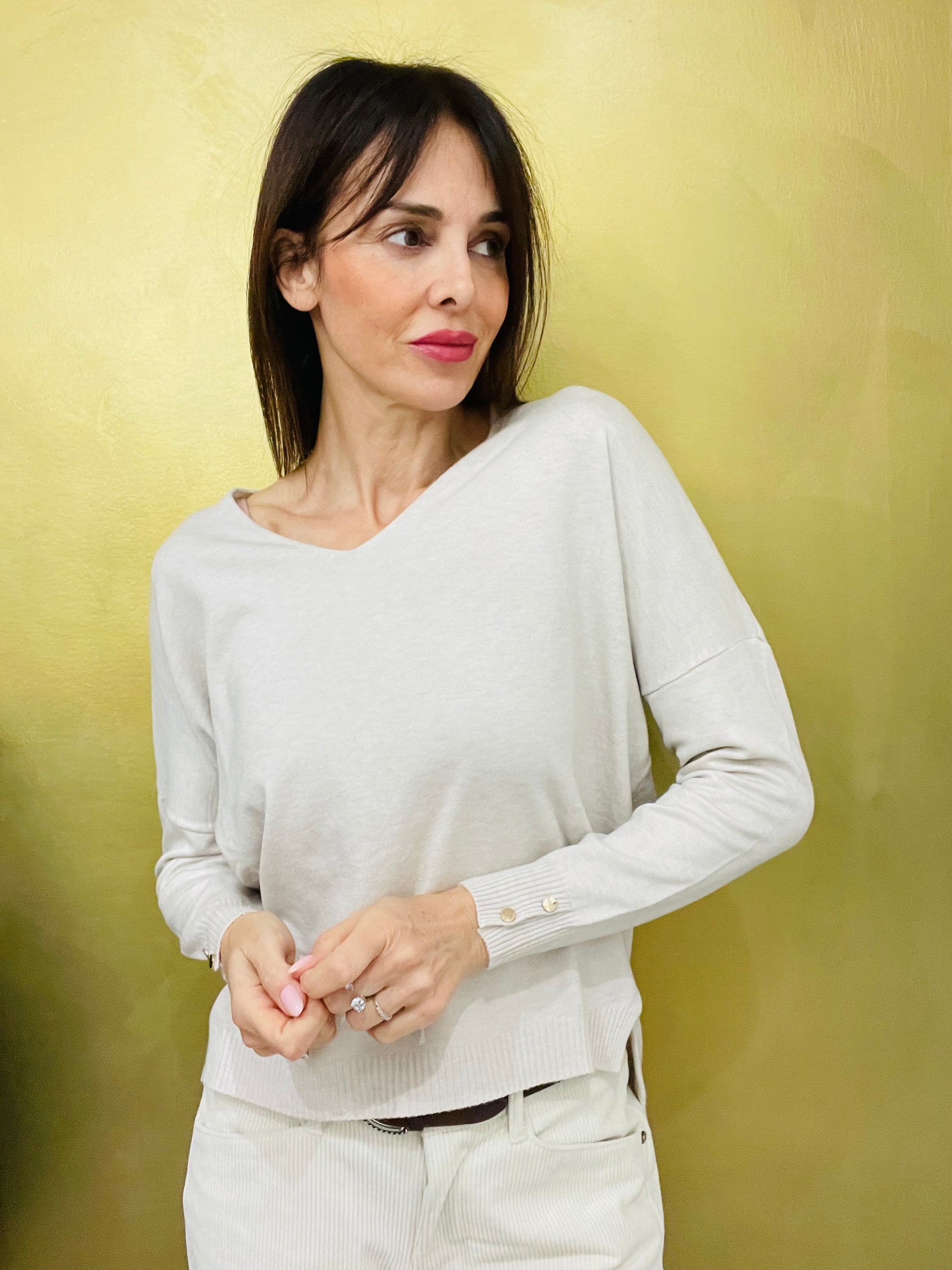Maglia con scollo a V dolce , vestibilità morbida in taglia unica ,leggermente più lunga nella parte posteriore spacchettini laterali e costine presente sul fondo maglia e sul polsino, dove sono applicati due bottoncini dorati
