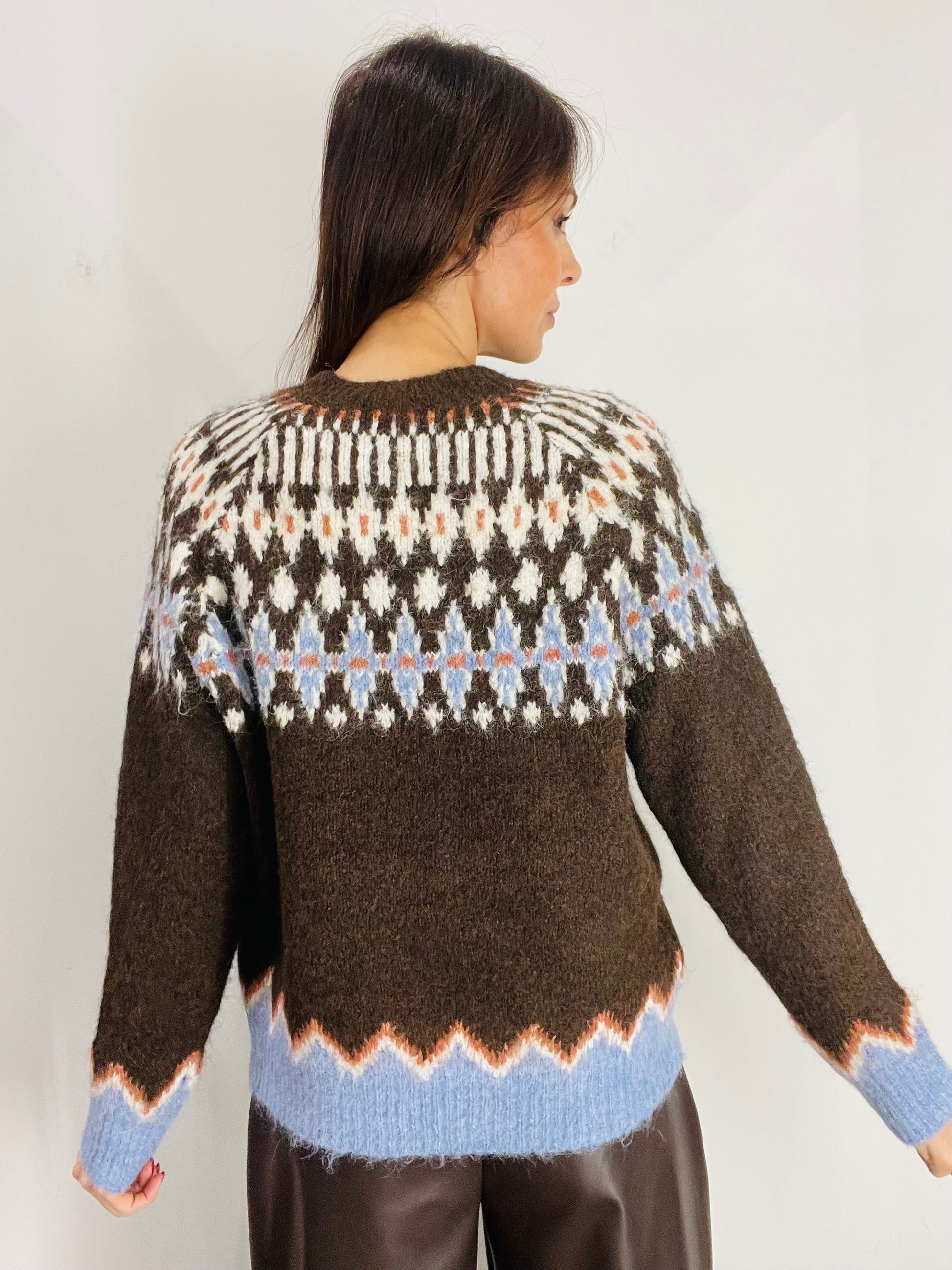 Maglione norvegese a girocollo, dettagli di costina sul fondo manica sul fondo maglia e sul girocollo