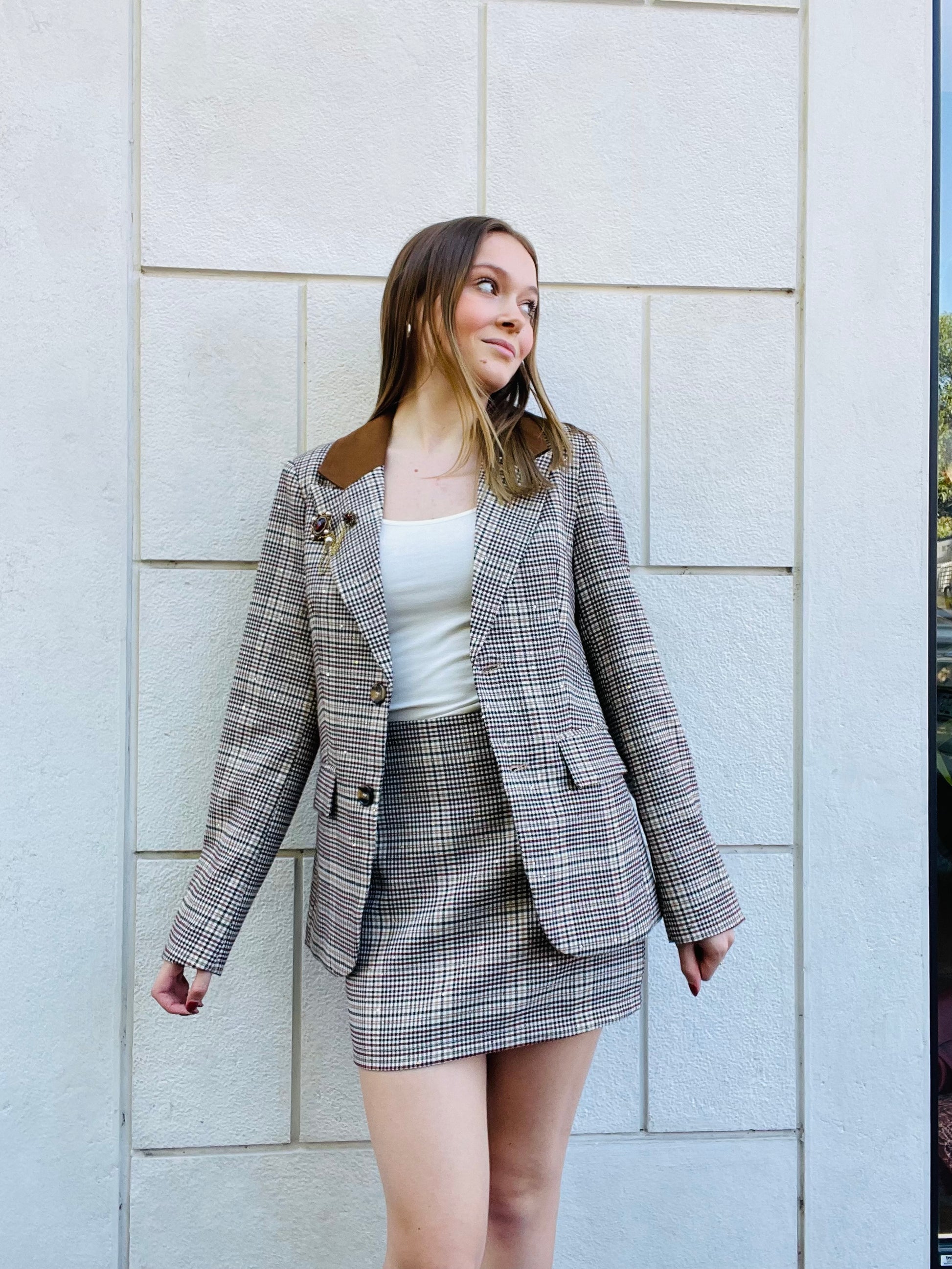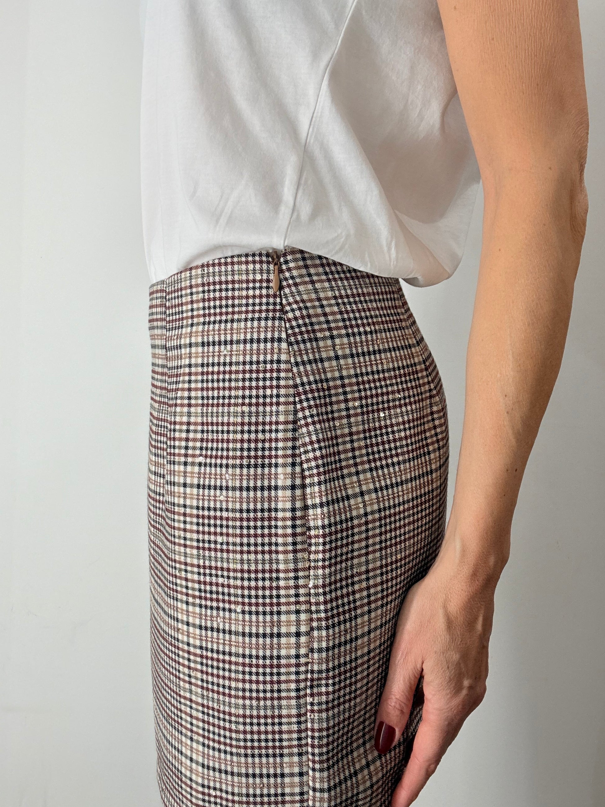 Mini gonna in fantasia check con applicazione di paillettes, chiusura con zip nella parte sinistra indossata, gonna con fodera all’interno