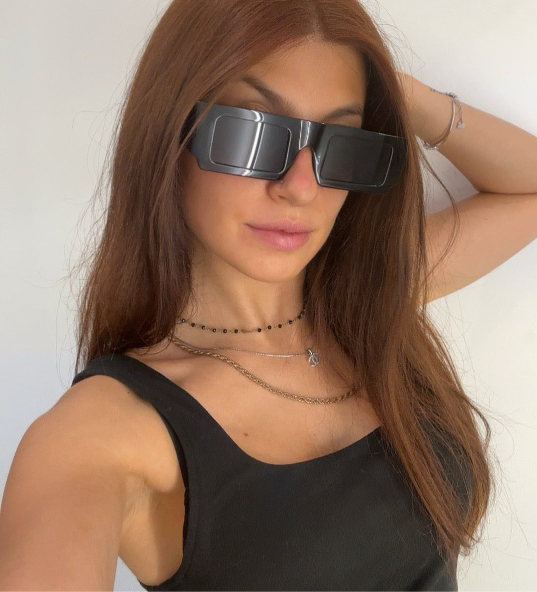 Occhiale con dettaglio di montatura grossa dalla forma rettangolare