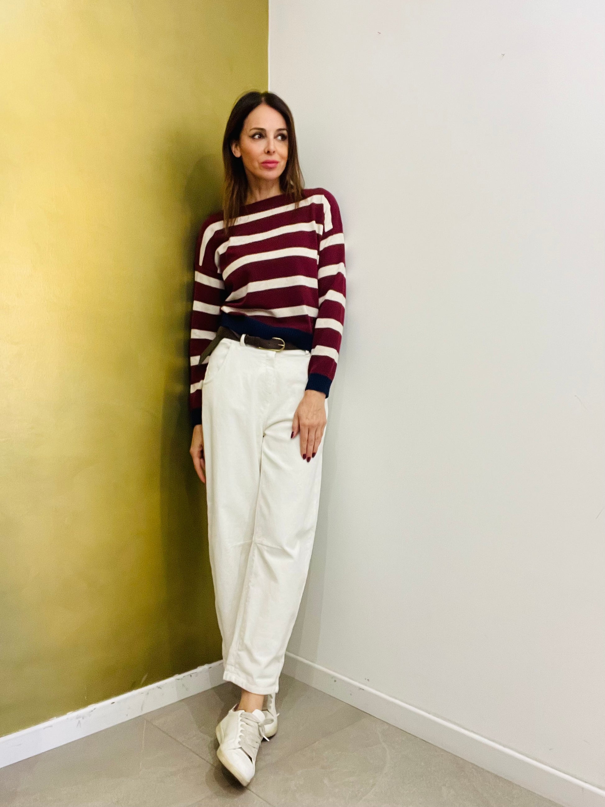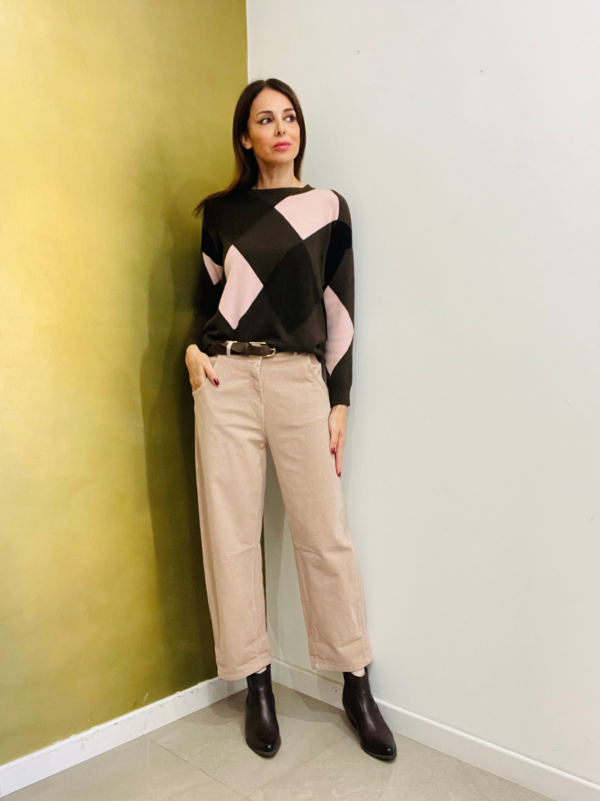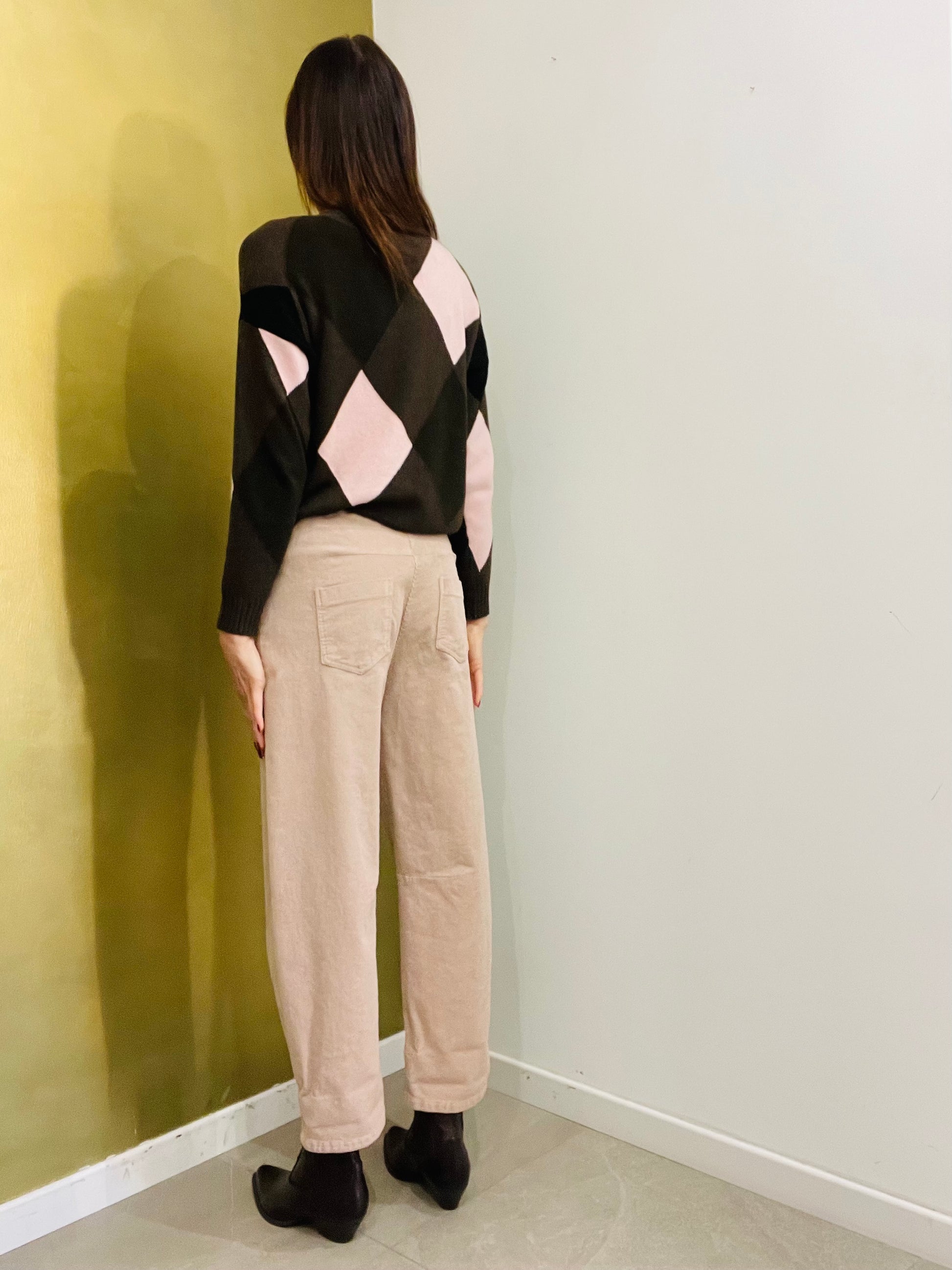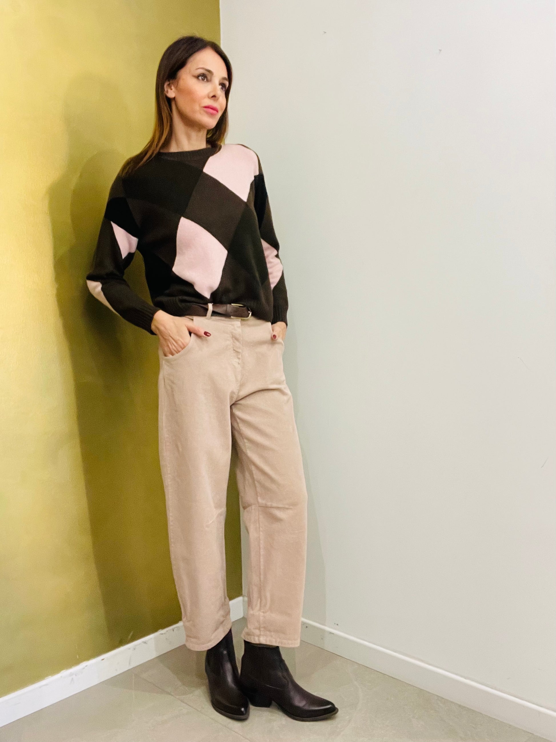 Pantalone millerighe dalla linea morbida ad ovetto con tasche laterali e sul retro. Con elastico sul retro vita con passanti in vita con cintura compresa, chiusura con zip e bottone