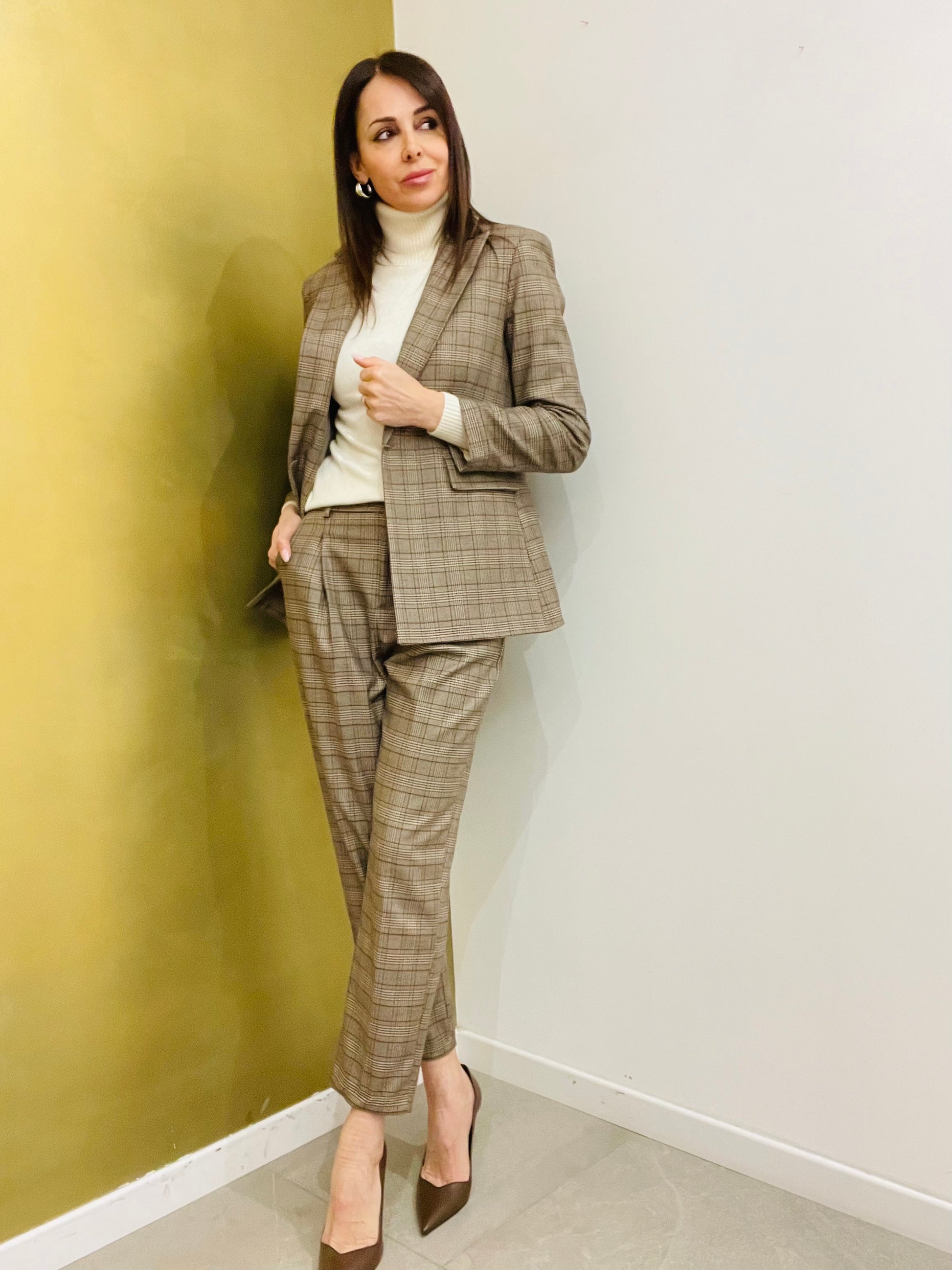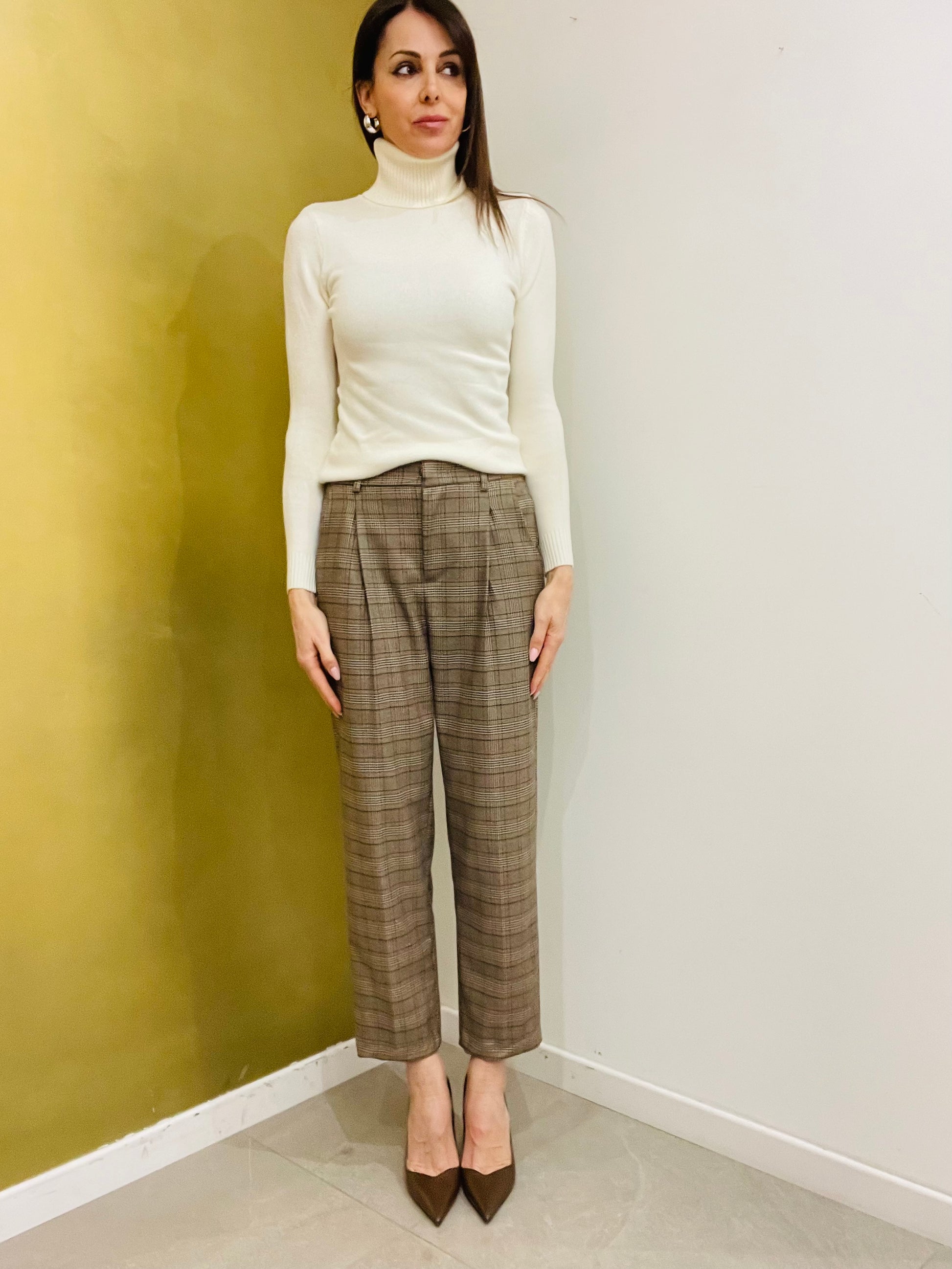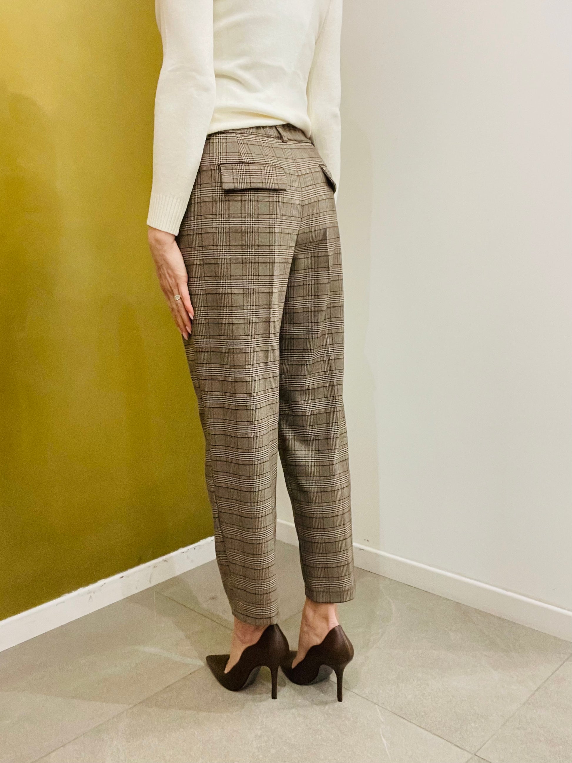 Pantalone in fantasia principe di galles dalla linea classica con pence sul davanti, tasche laterali e tasche a pattina sul retro, elastico sul retro vita con passanti per cintura