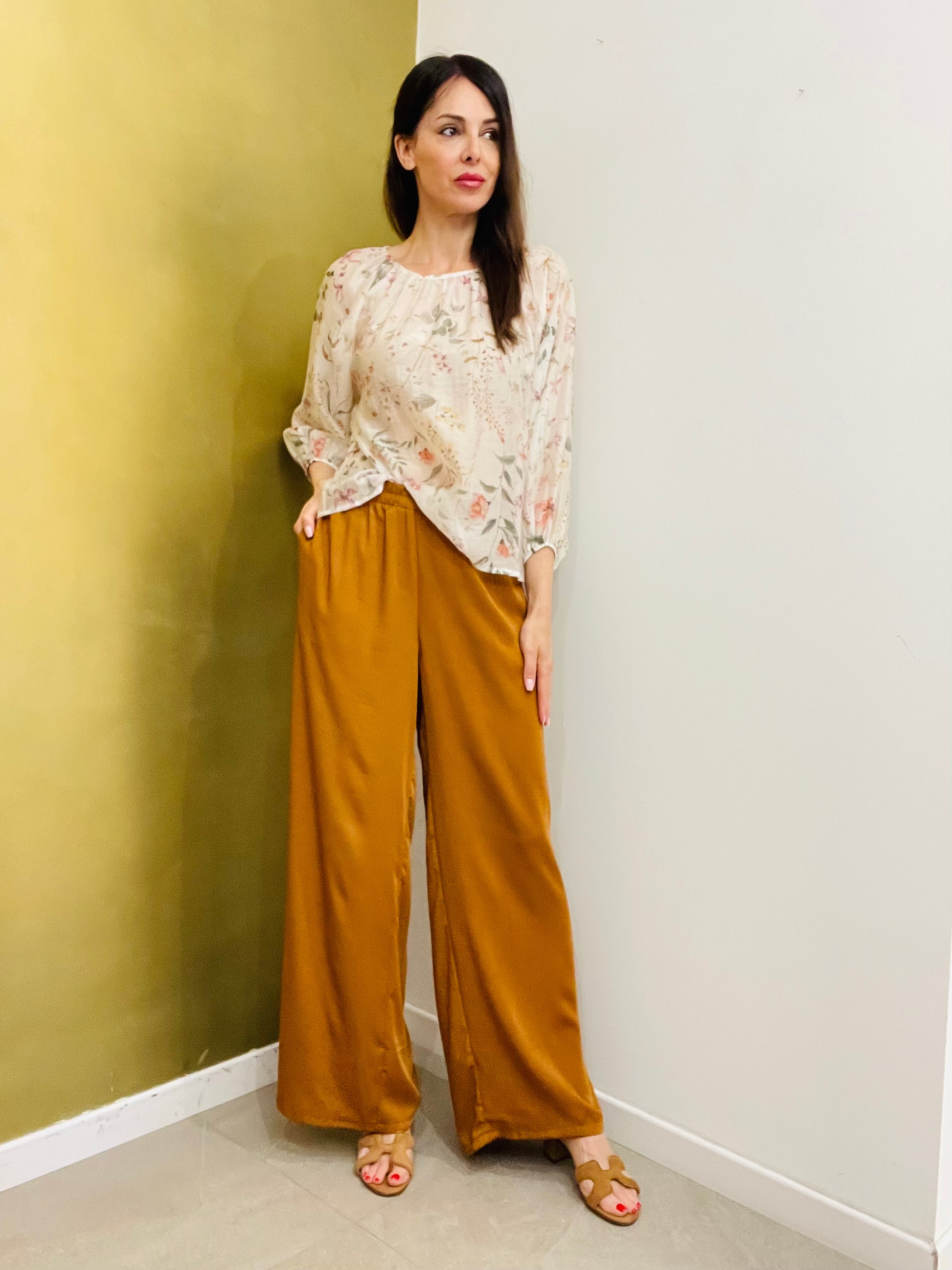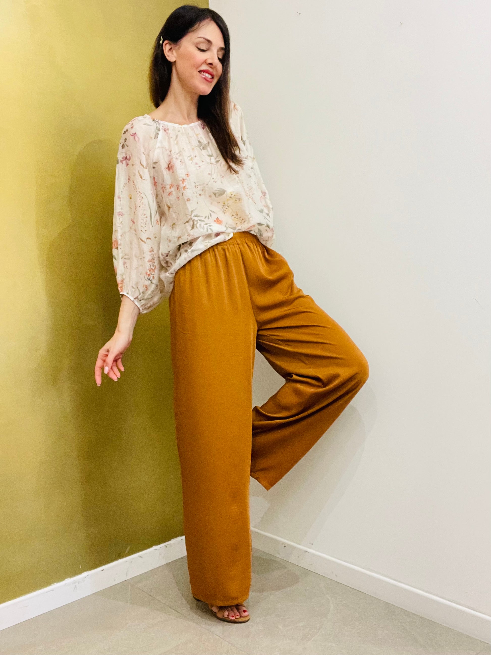 Pantalone palazzo in missili di cotone, elastico sul giro vita tasche laterali