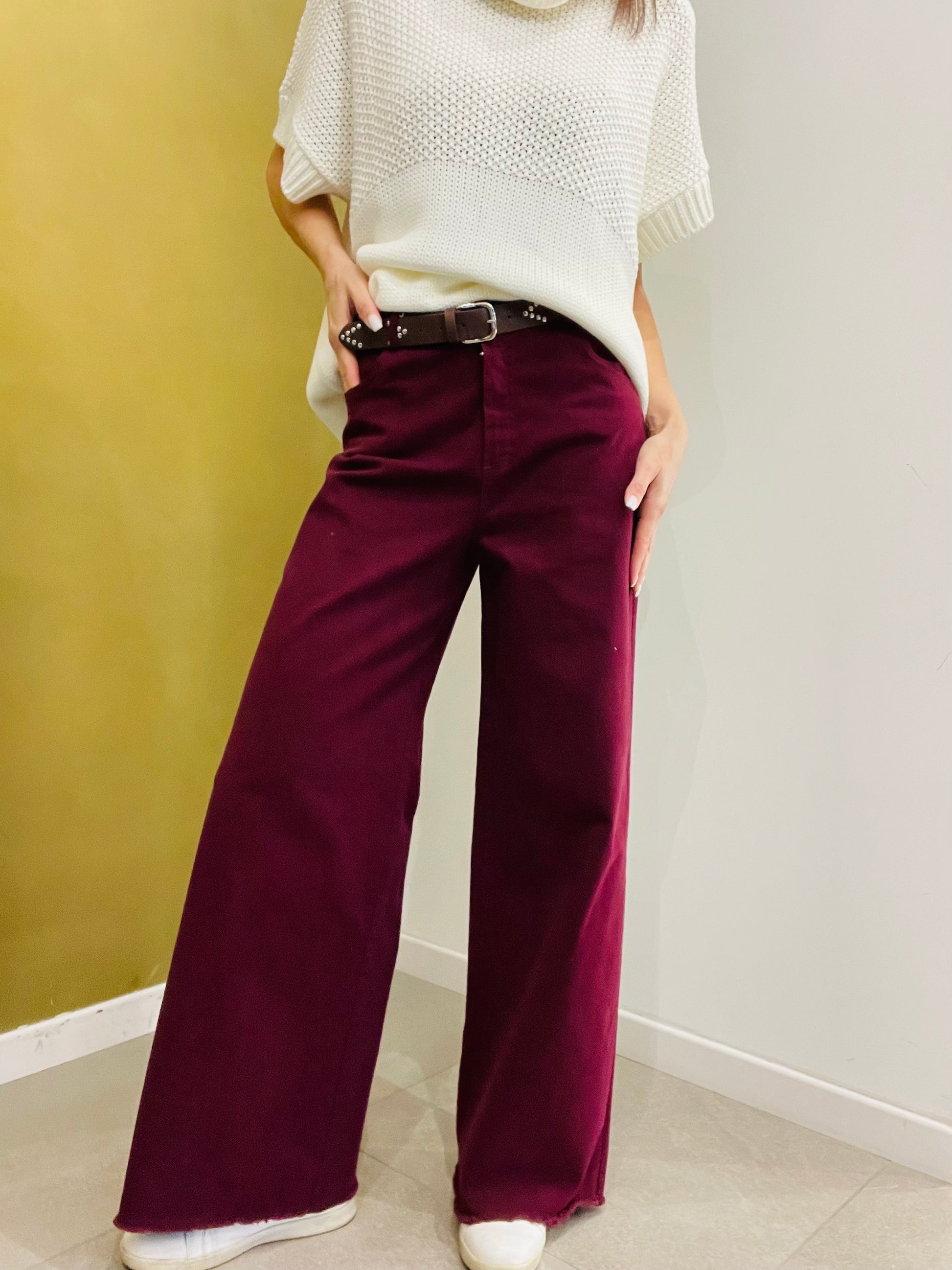 Pantalone dal taglia a palazzo a gamba larga con sfrangiatura a fine pantalone, tasche laterali e sul retro , passanti in vita con cintura compresa