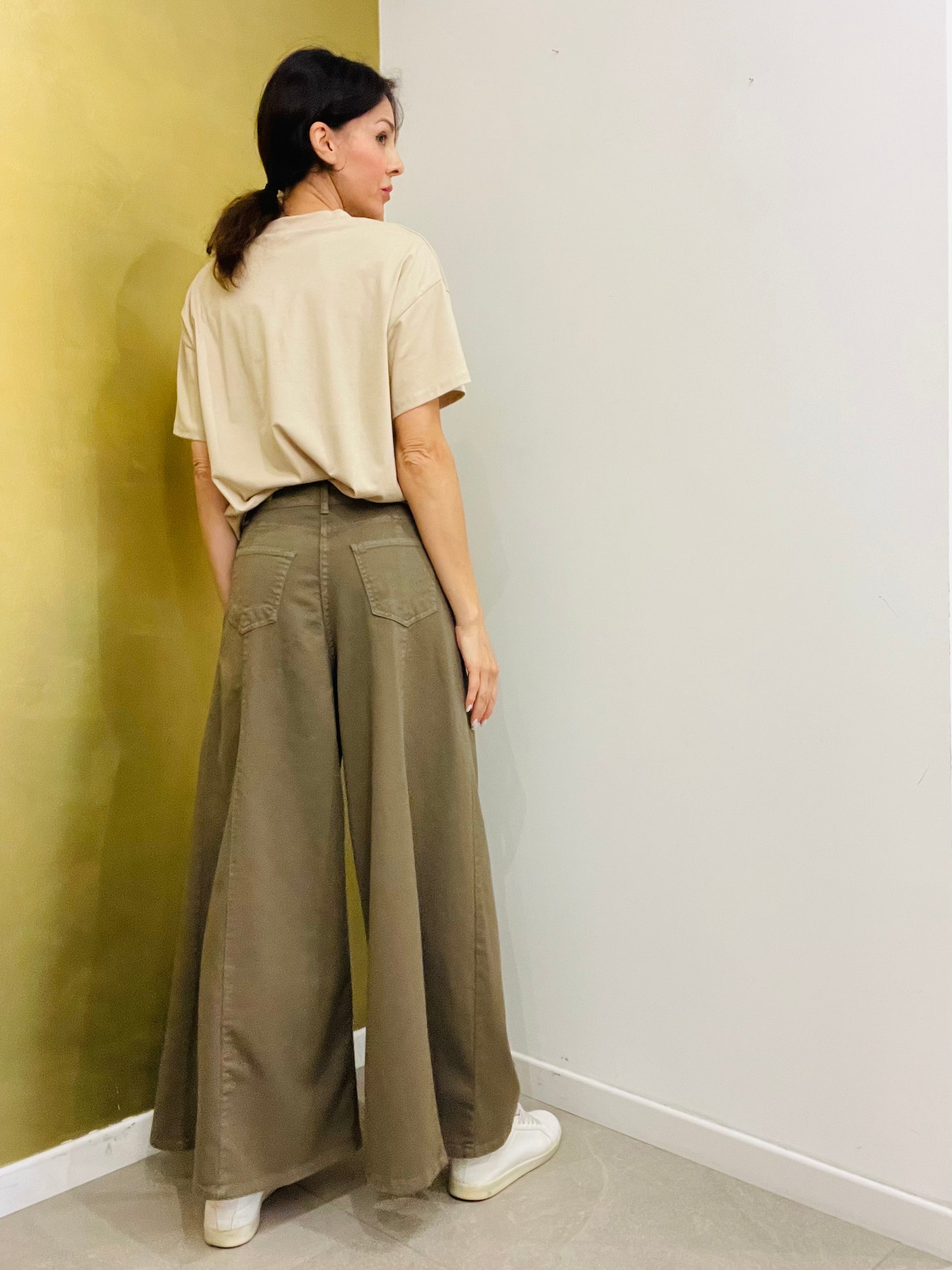 Pantalone a palazzo ampio con tasconi laterali e tasche sul retro, chiusura con zip e un bottone passanti in vita