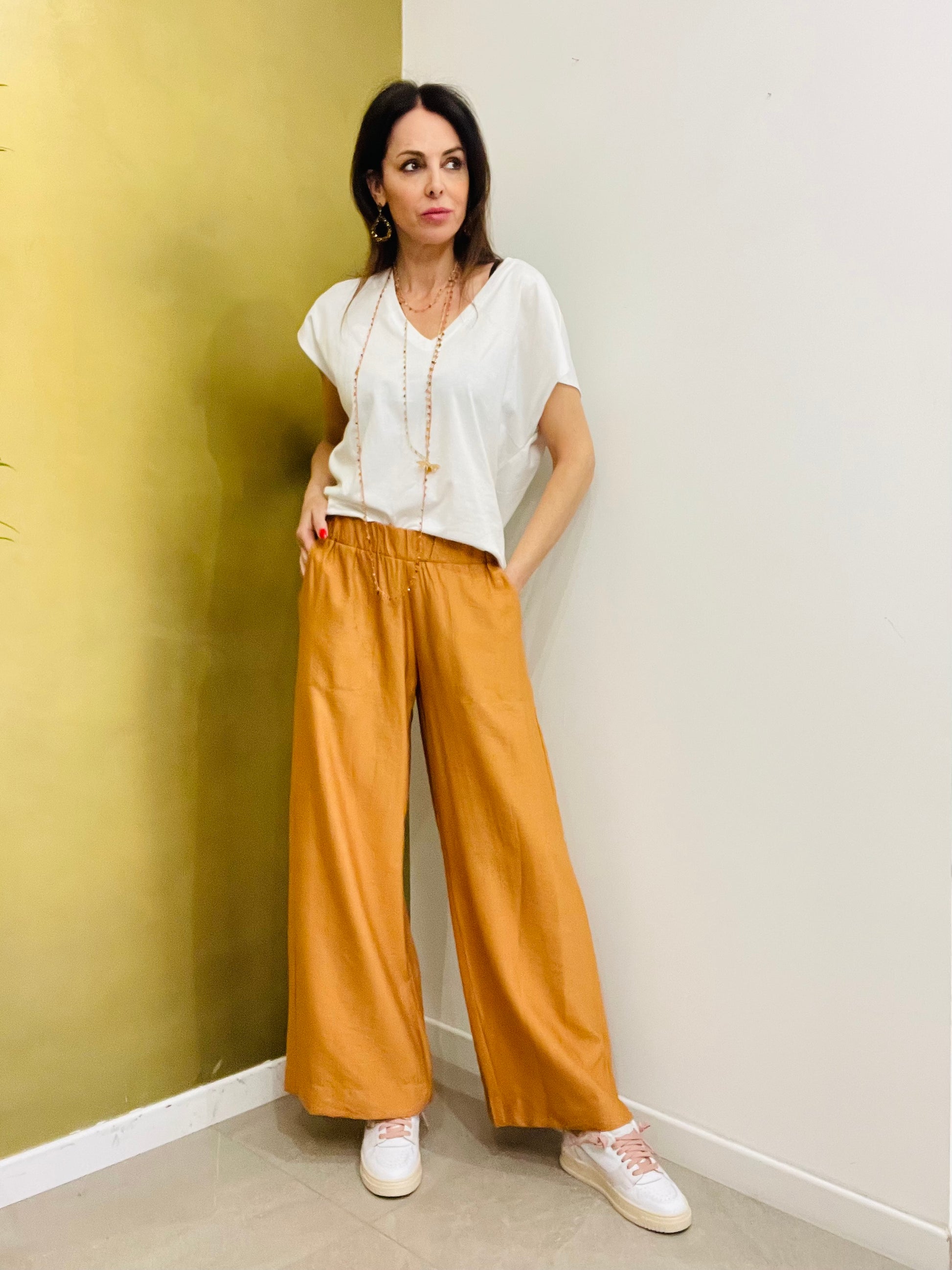 Pantalone dal taglio a palazzo con elastico sul giro vita tasche laterali e taschino sul retro sulla parte destra indossata