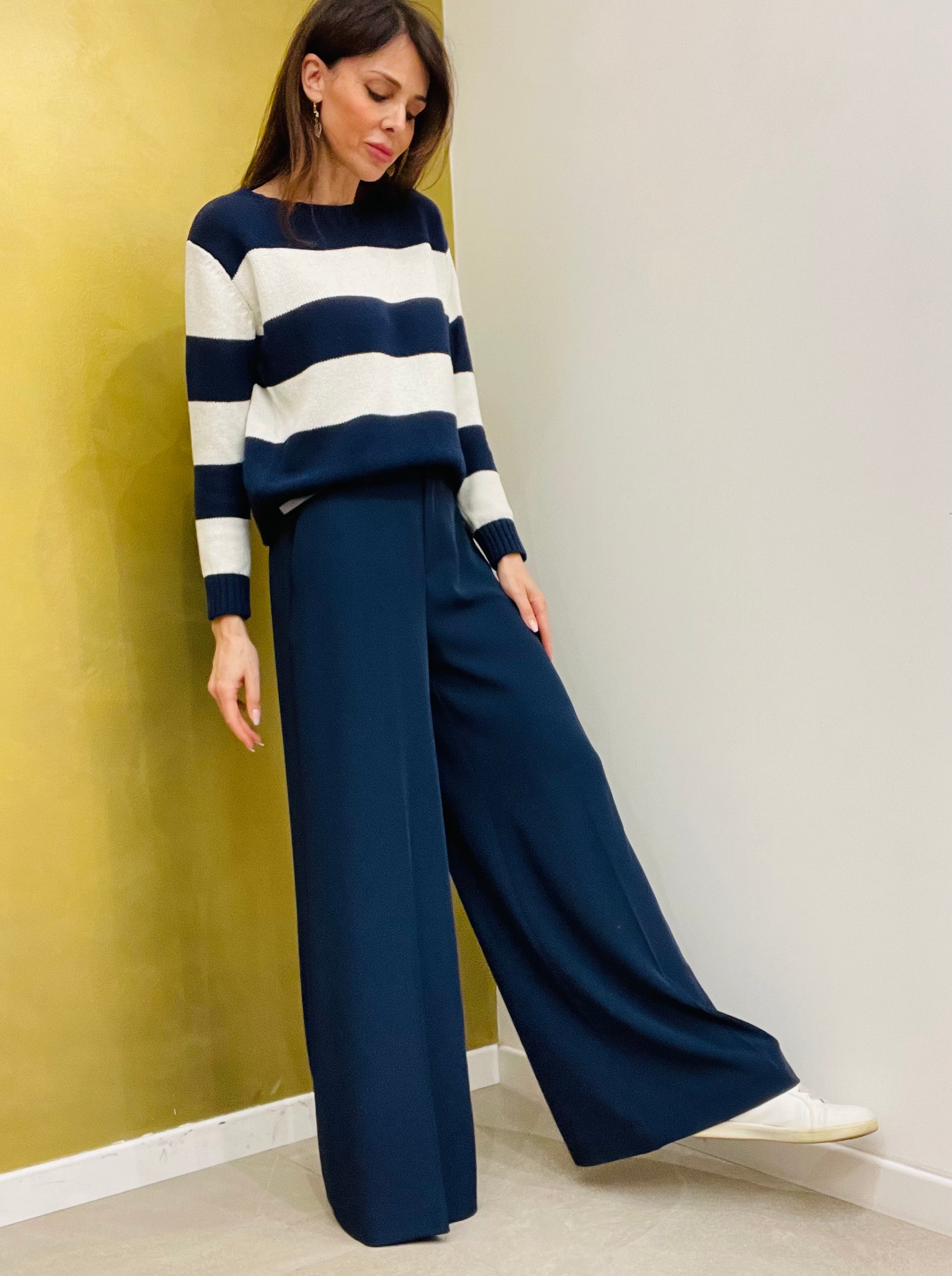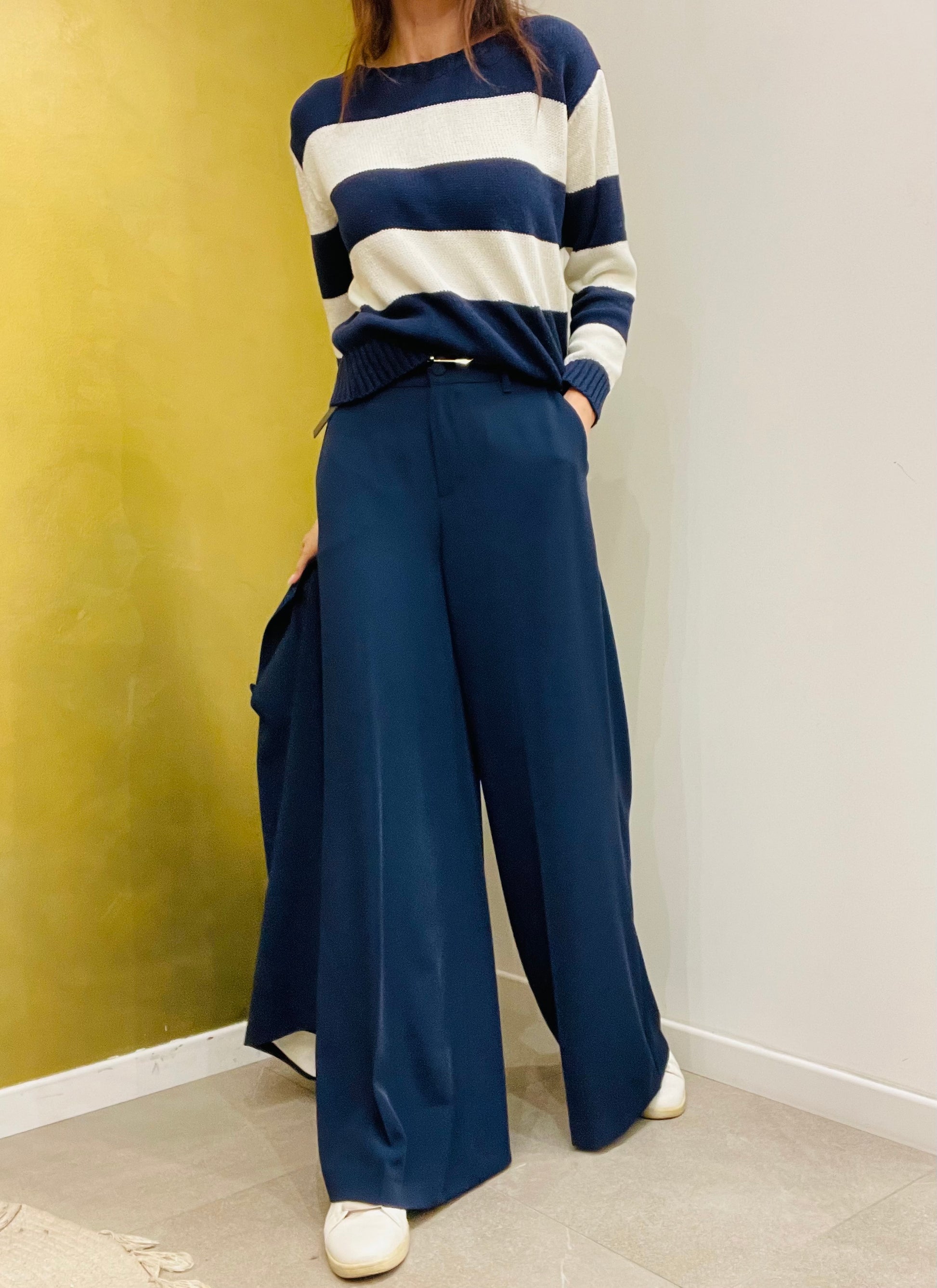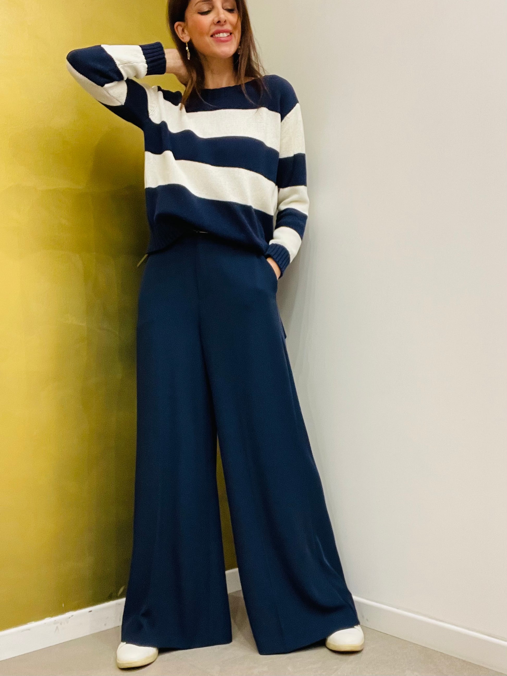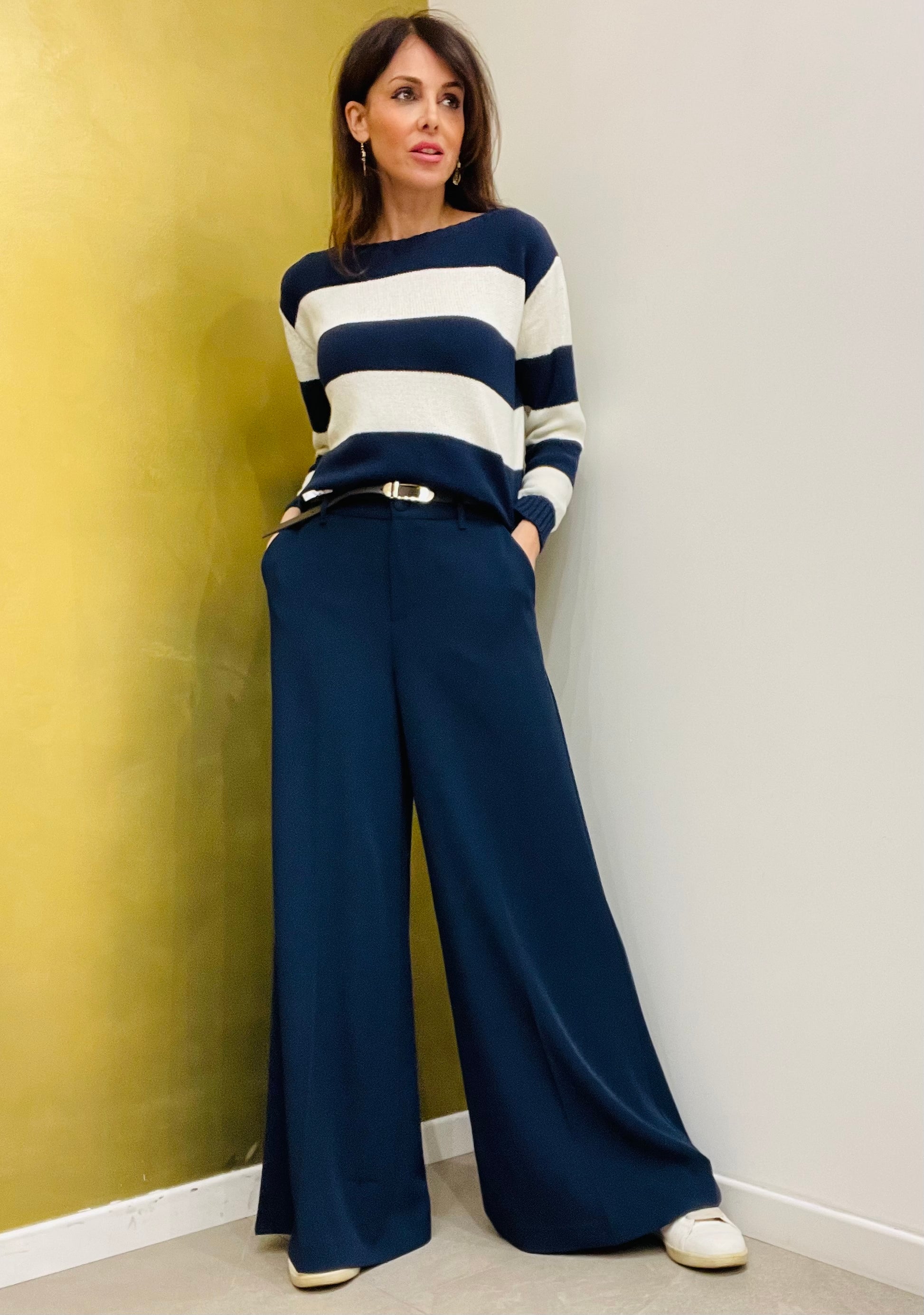 Pantalone a palazzo con elastico sul retro vita, chiusura con zip e un bottone con passanti per cintura