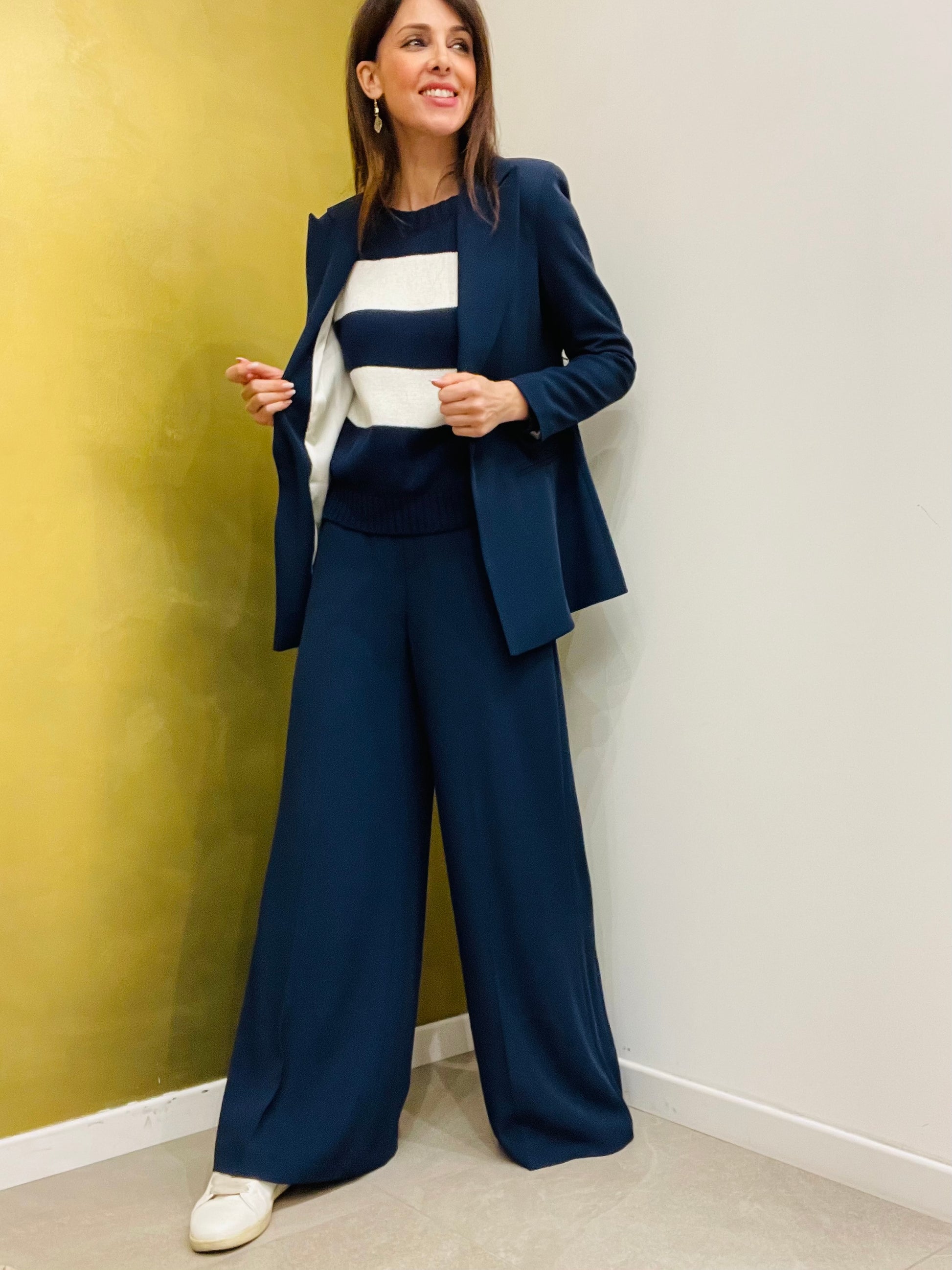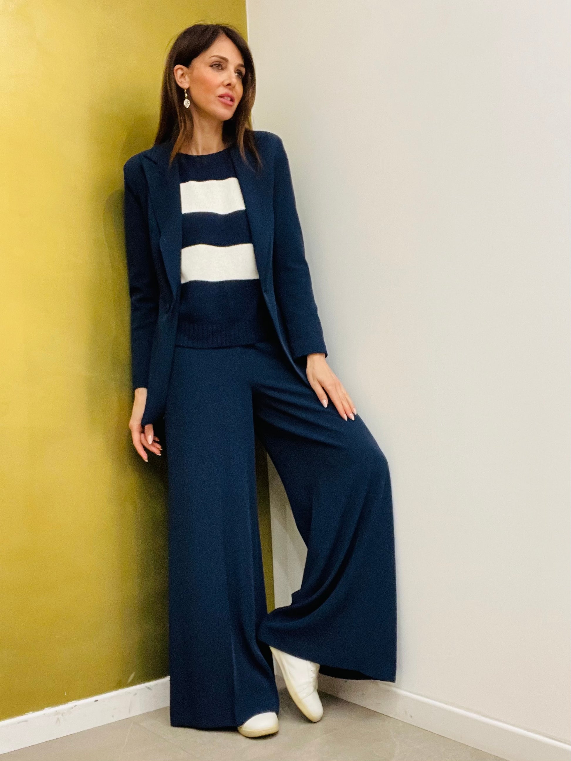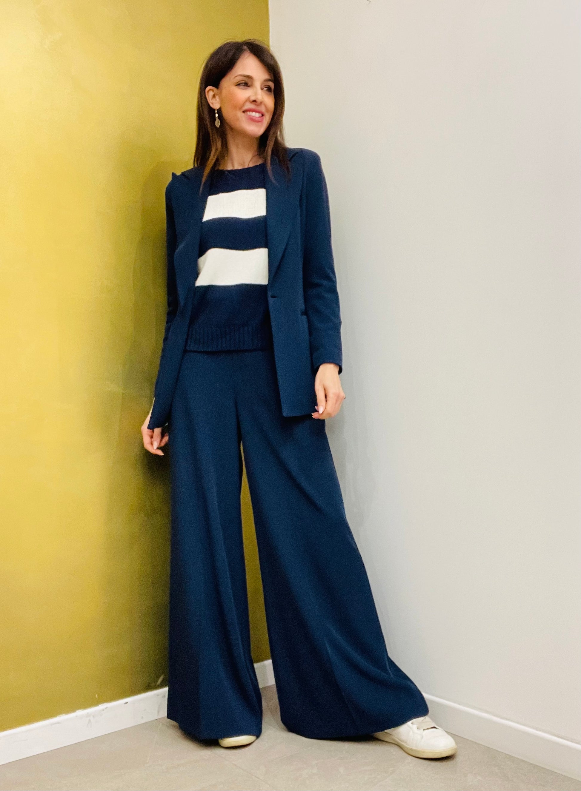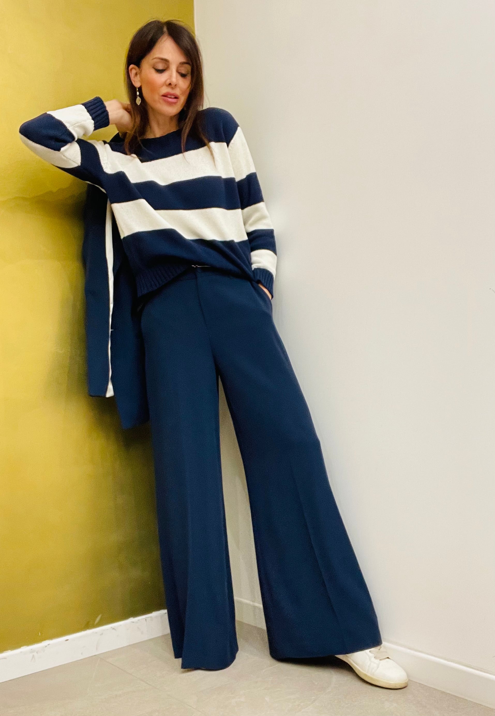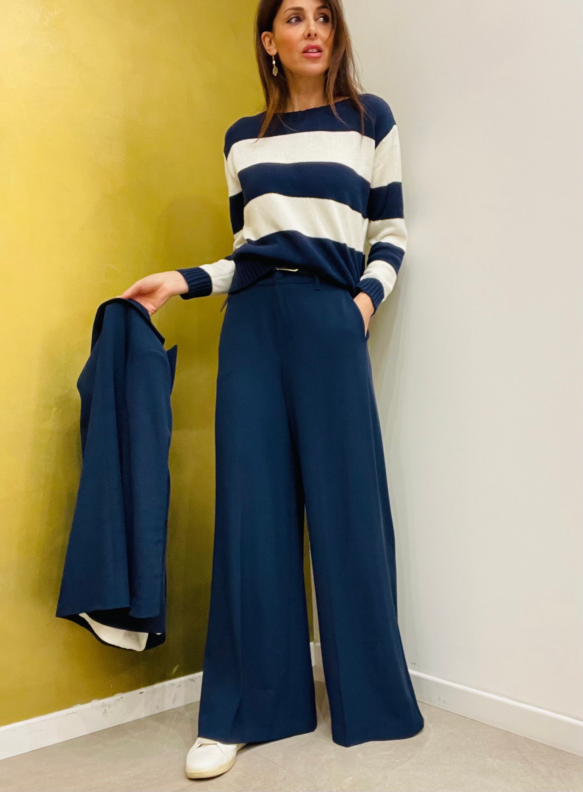 Pantalone a palazzo con elastico sul retro vita, chiusura con zip e un bottone con passanti per cintura