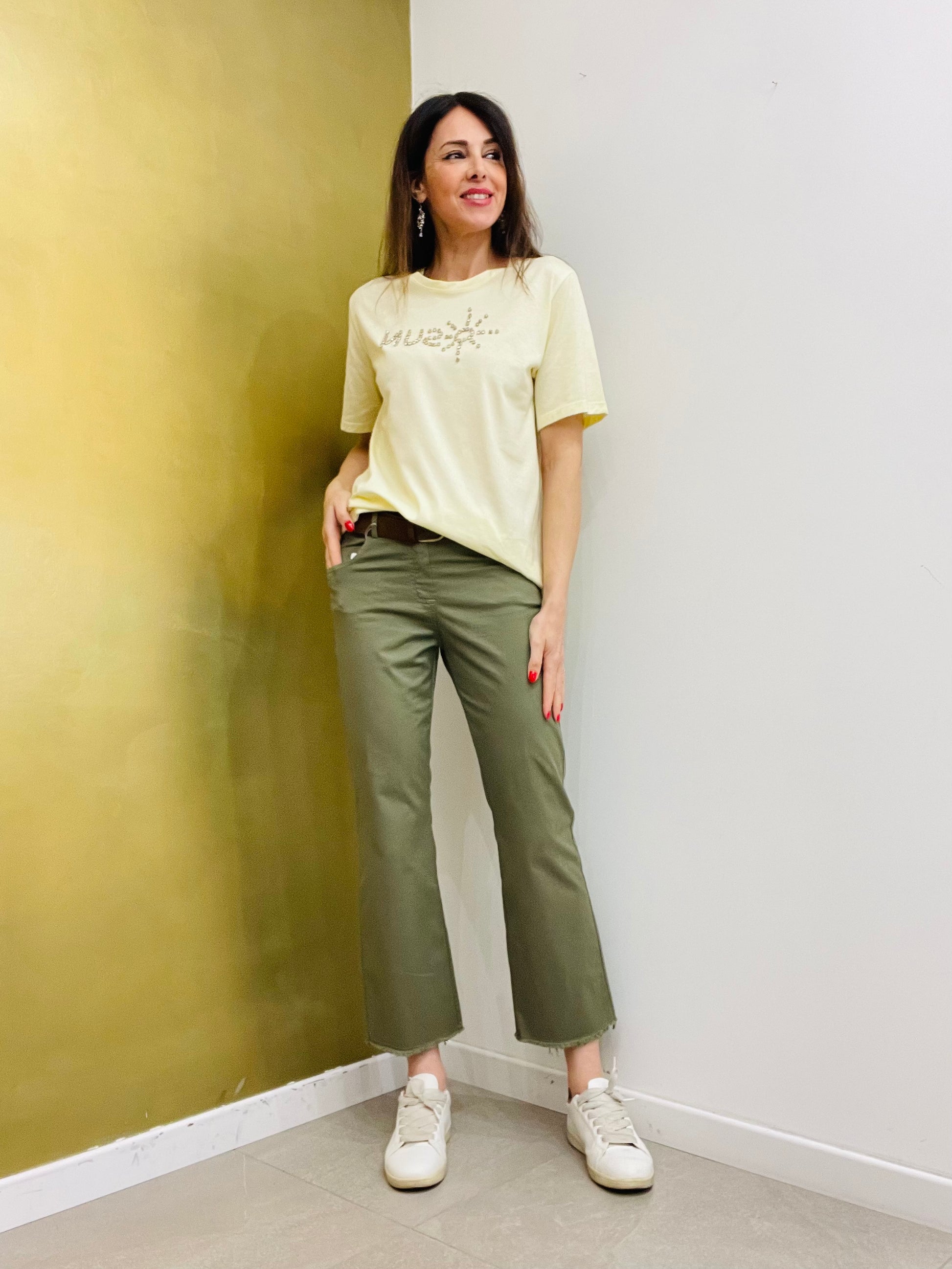 Pantalone dalla linea a trombetta con quattro tasche, zip e passanti in vita compreso di cintura sfrangiatura sul fondo del pantalone