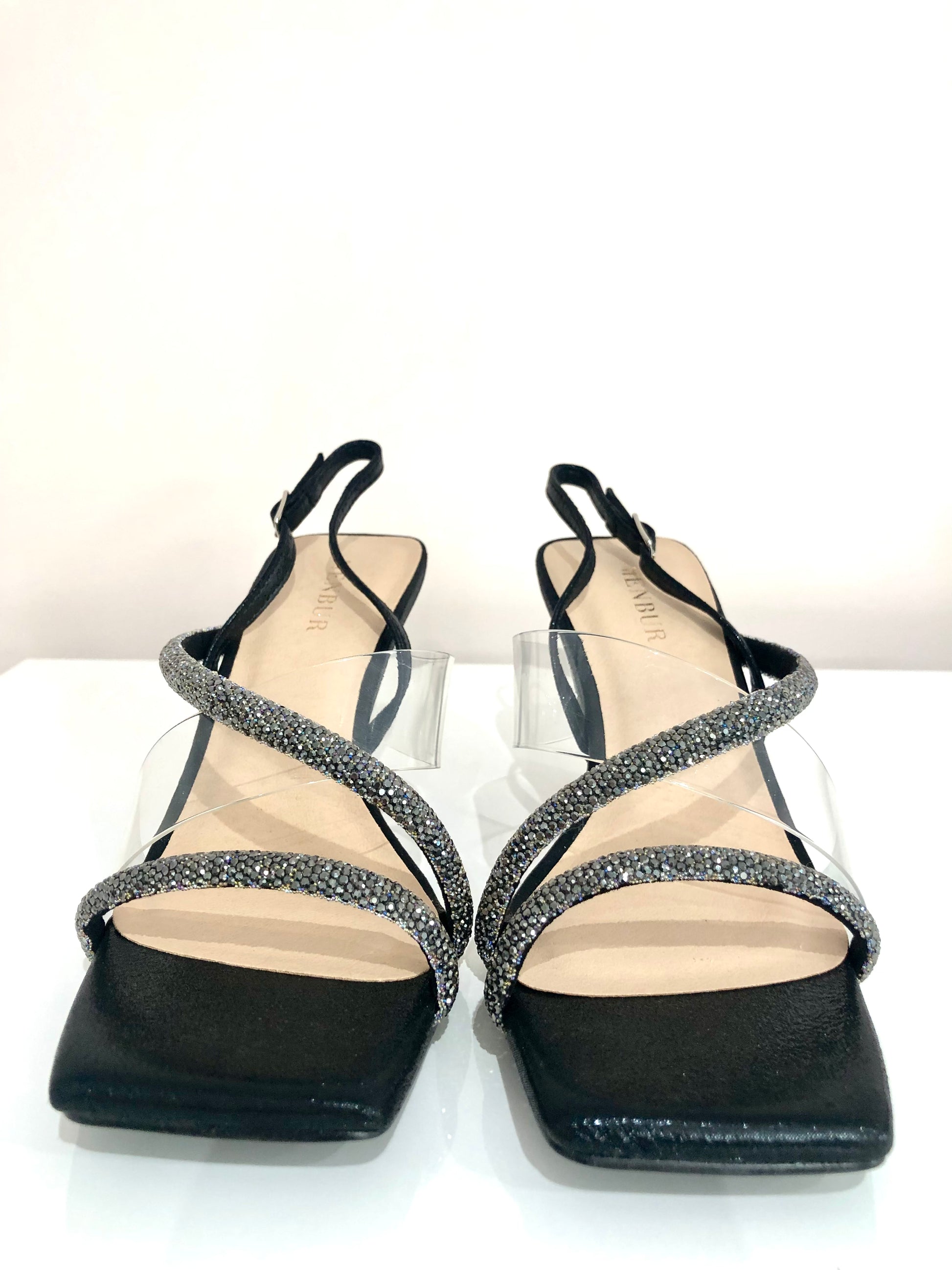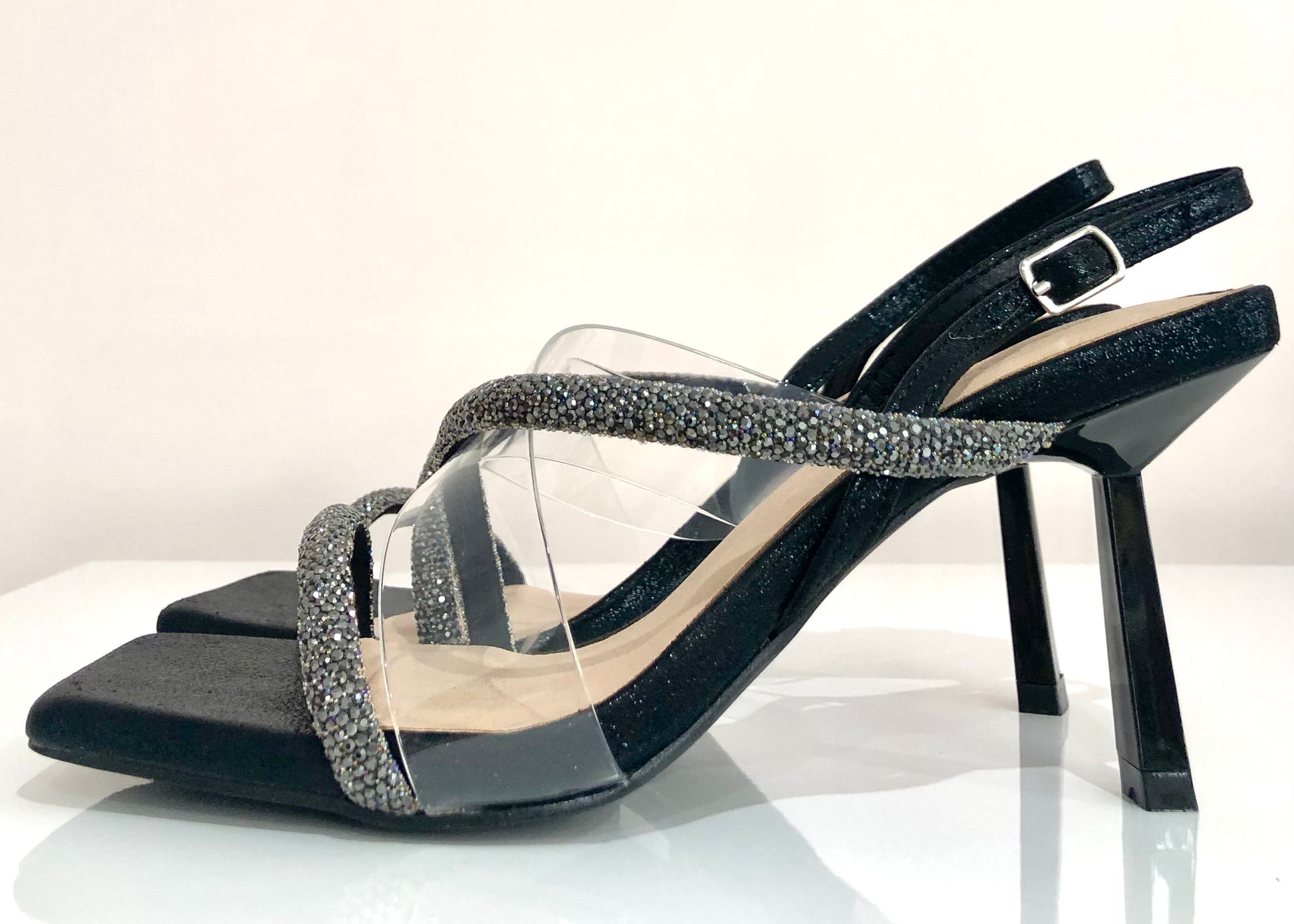 Sandalo con particolarità di intrecci ricoperti di strass.