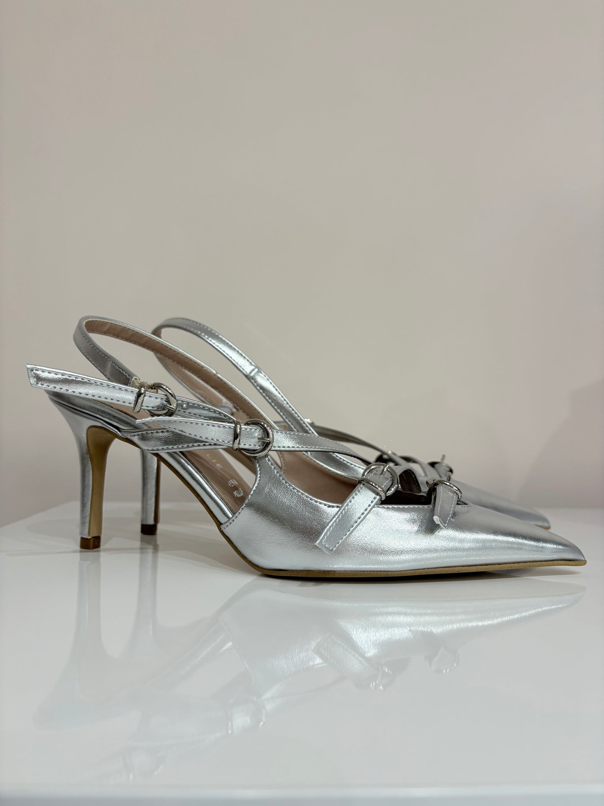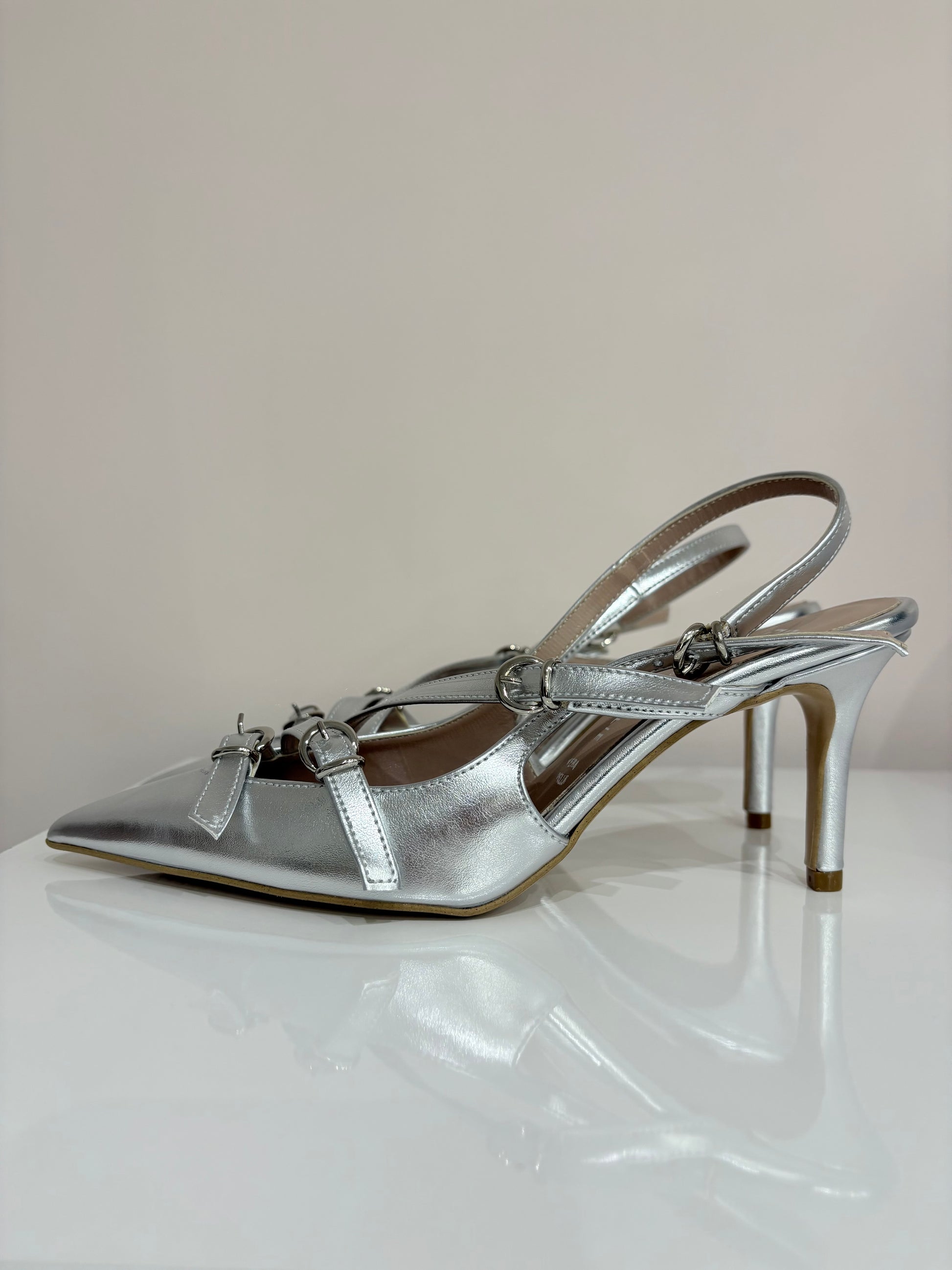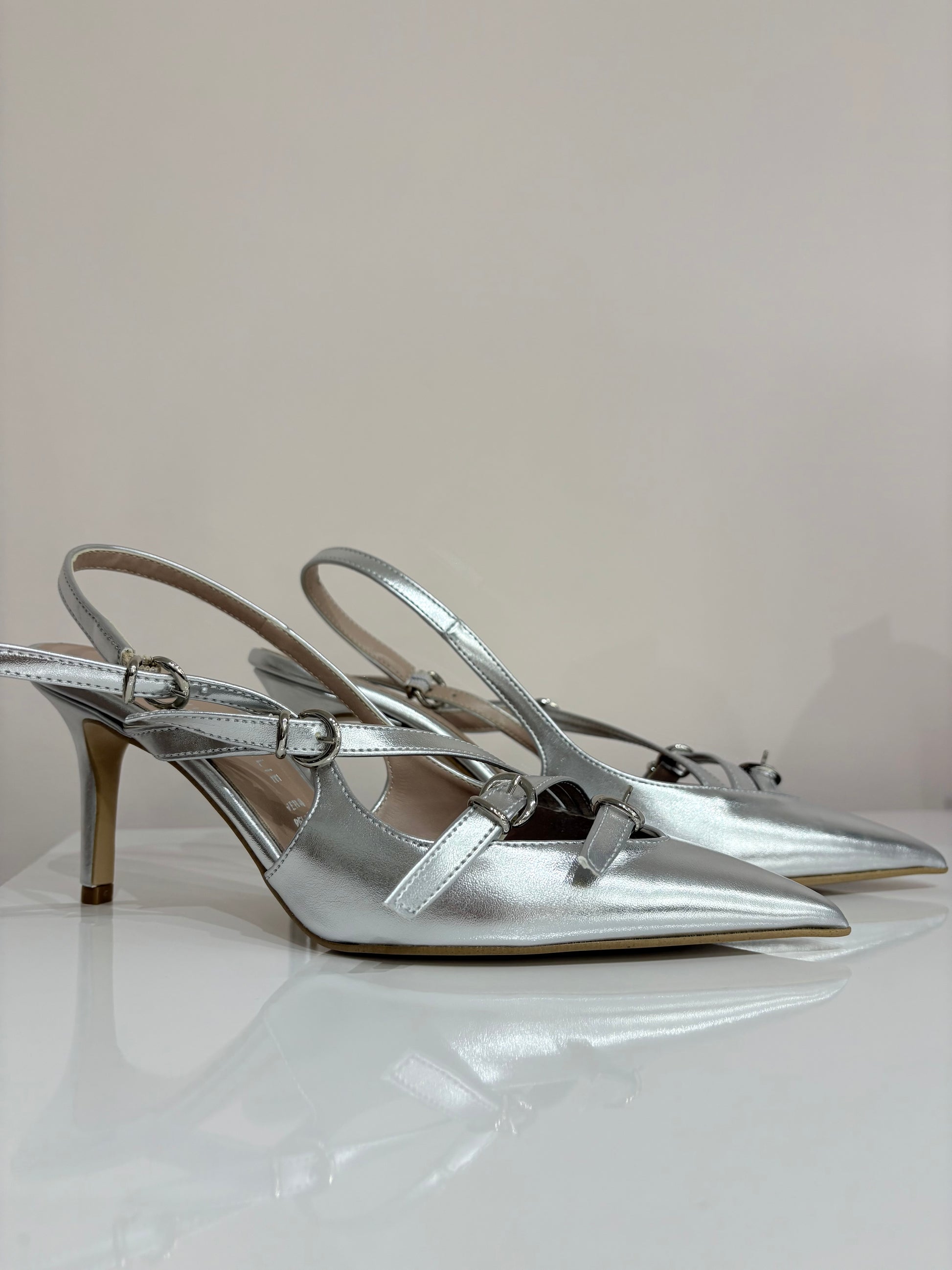 Slingback in vera pelle dalla colorazione argentata, dettagli di cinturini in pelle, e cinturino regolabile