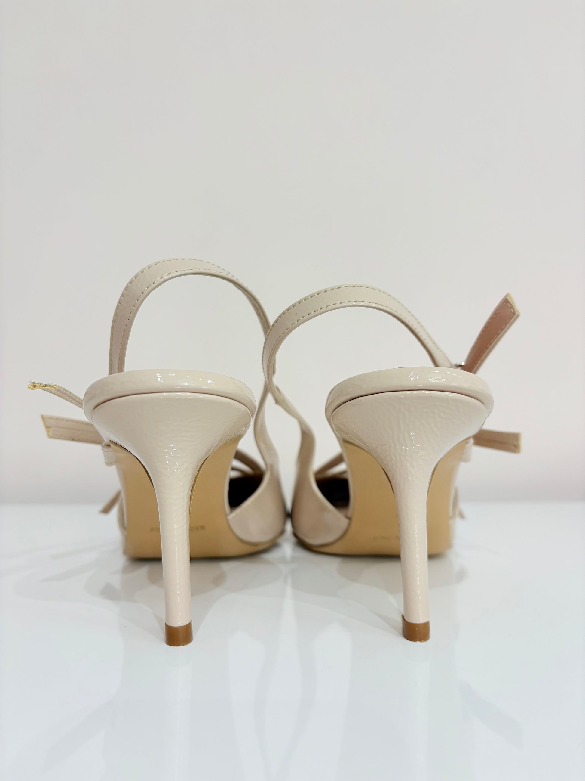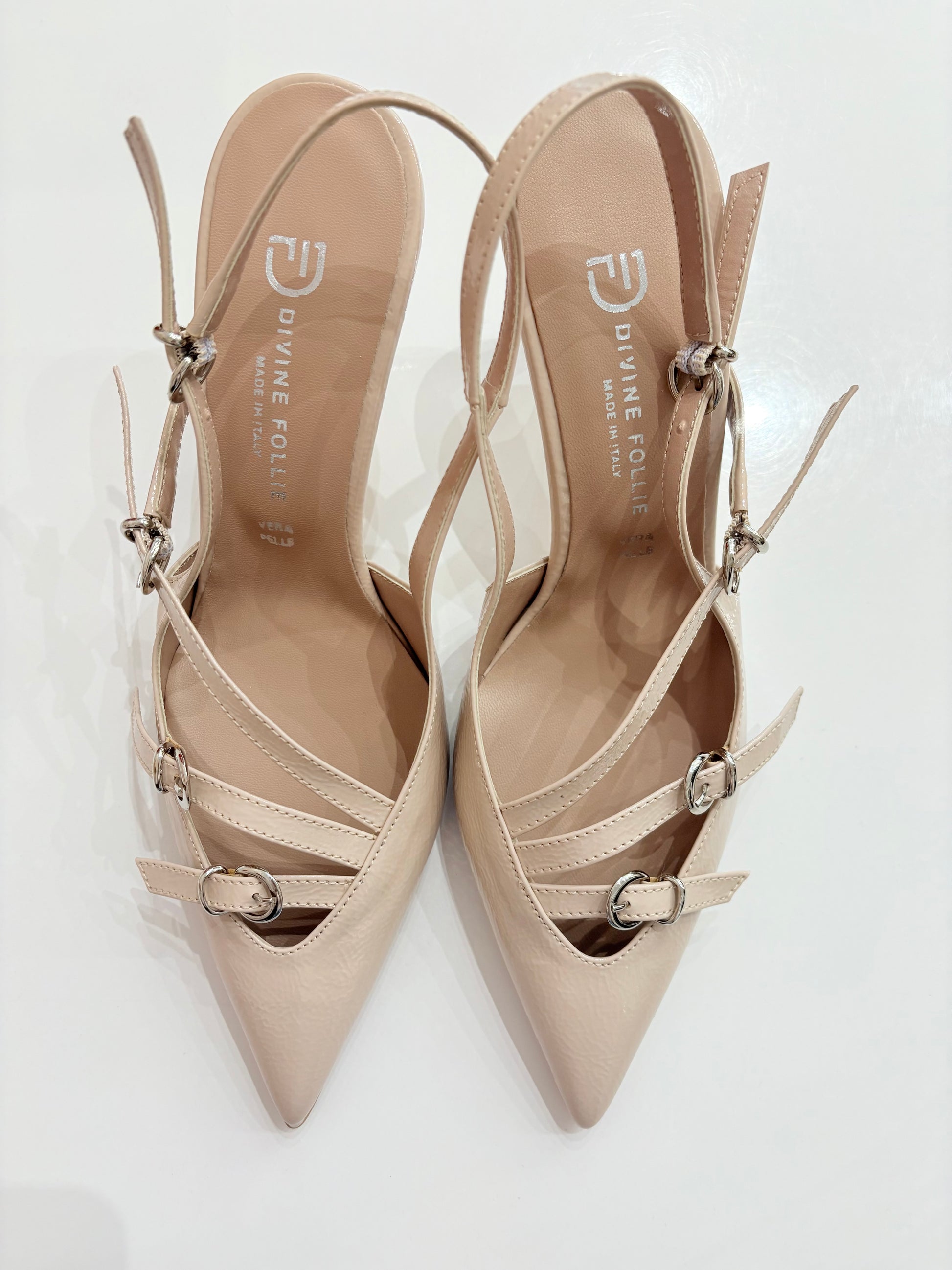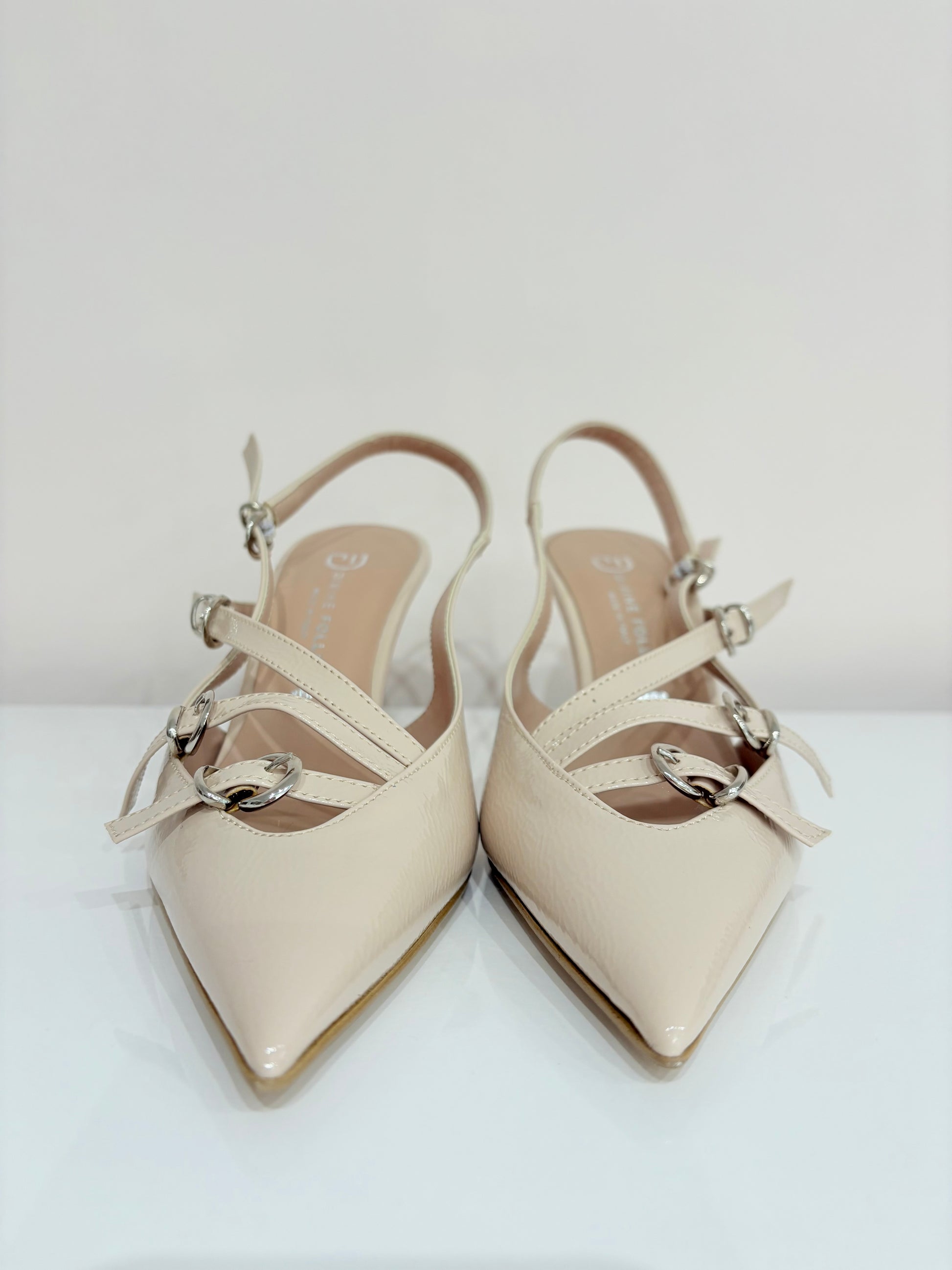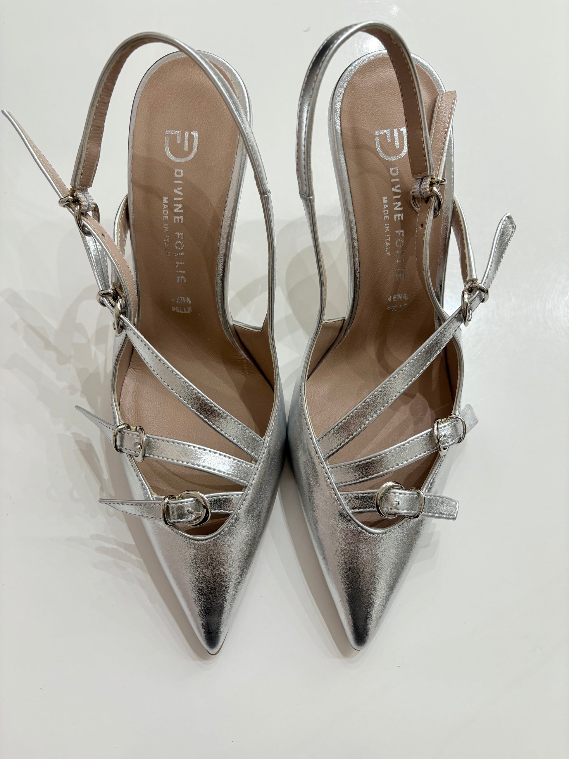 Slingback in vera pelle dalla colorazione argentata, dettagli di cinturini in pelle, e cinturino regolabile