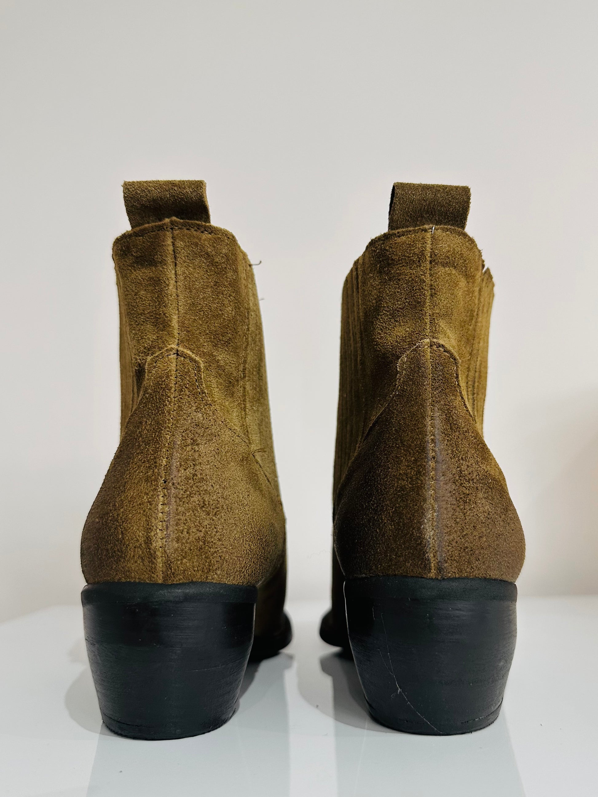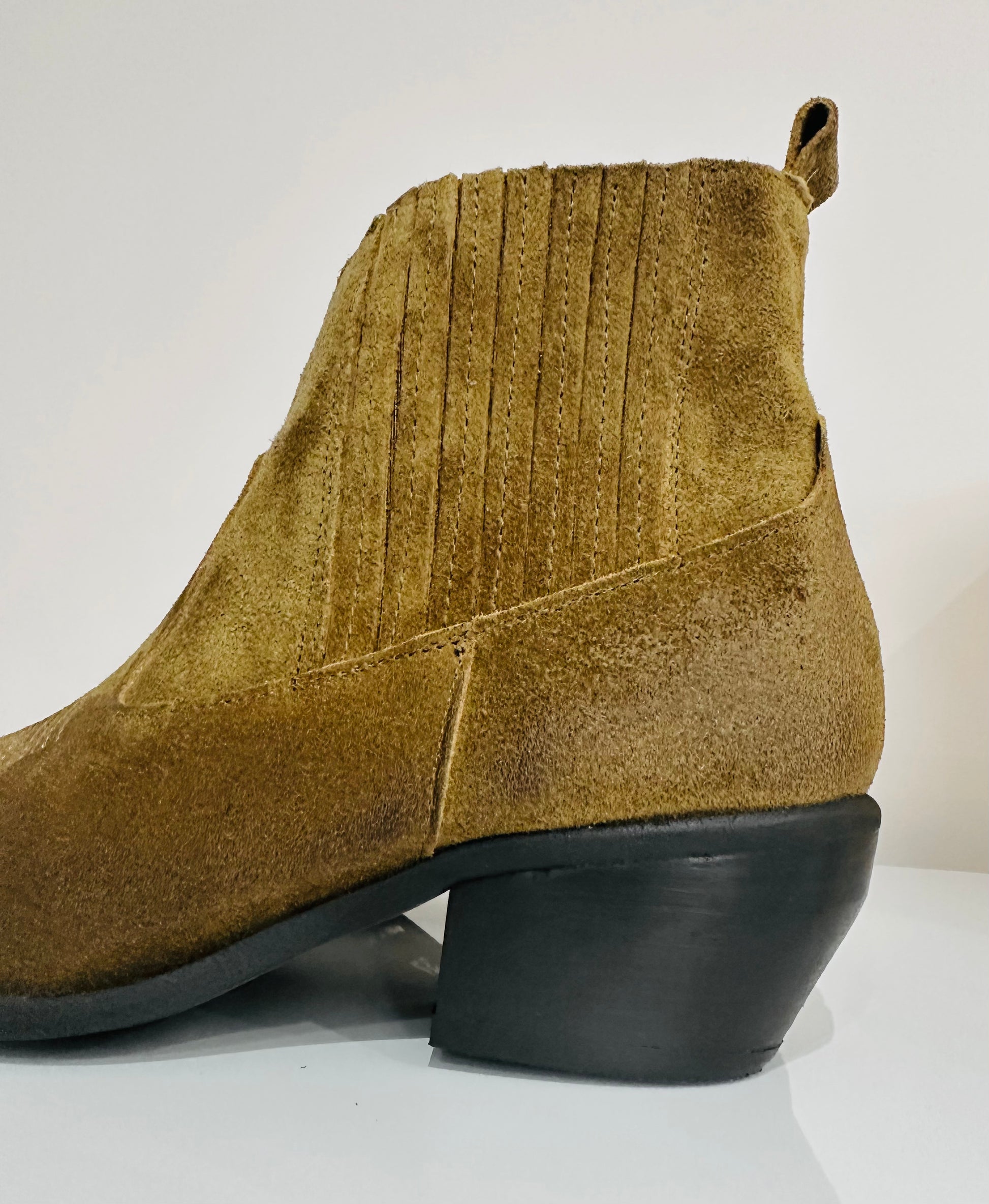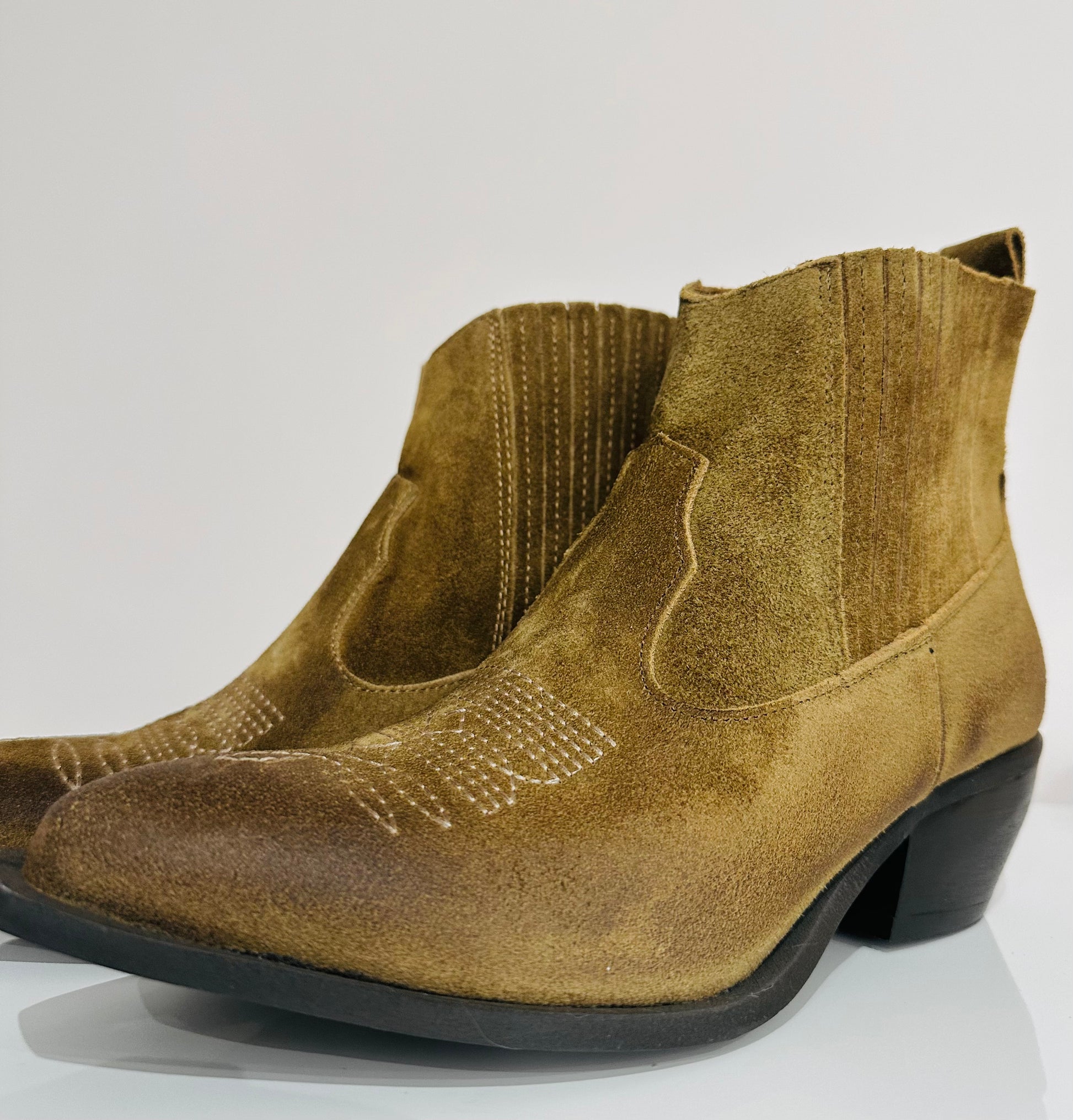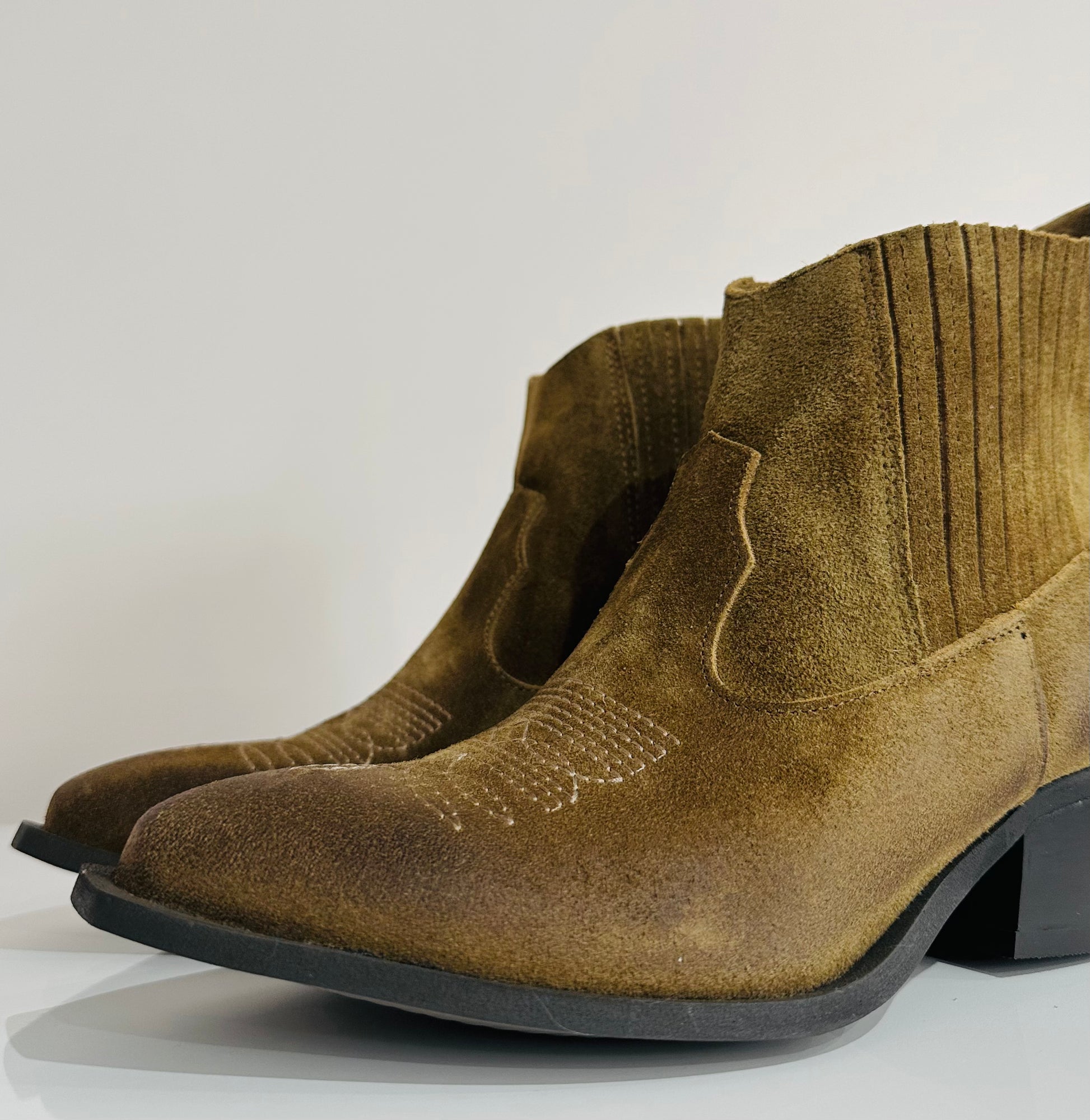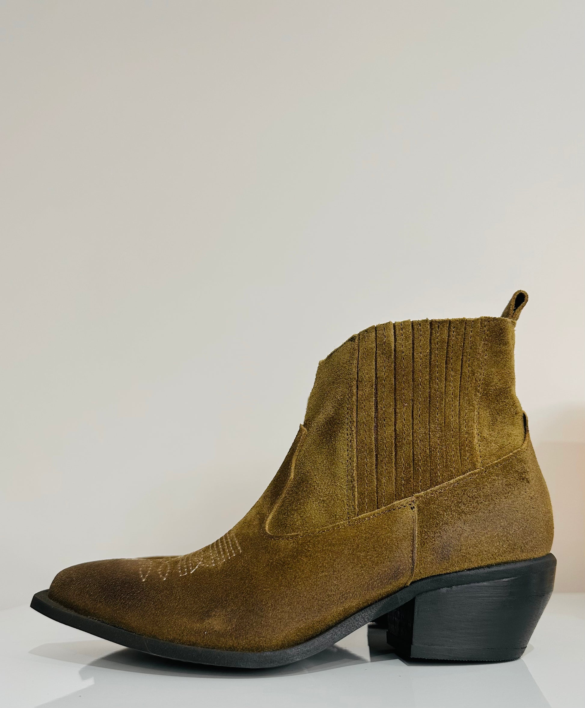 Stivale texano basso in camoscio con particolari ricami a contrasto lungo tutto lo stivaletto e nella parte frontale