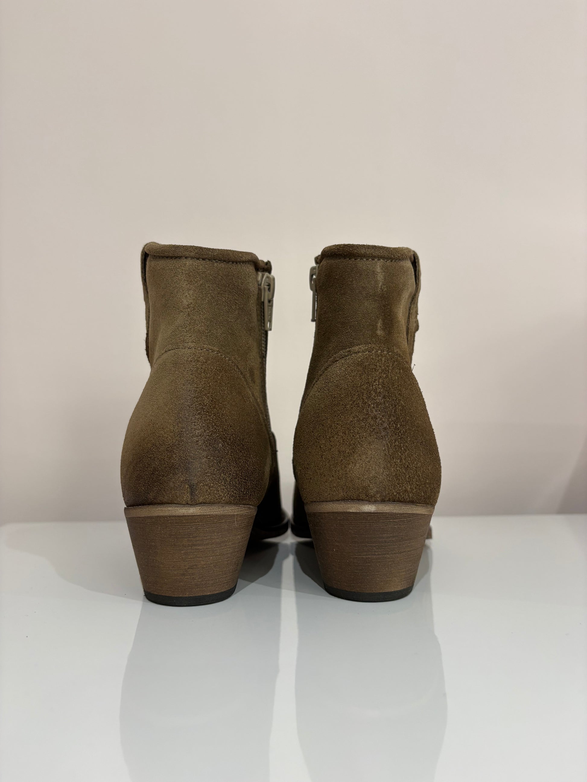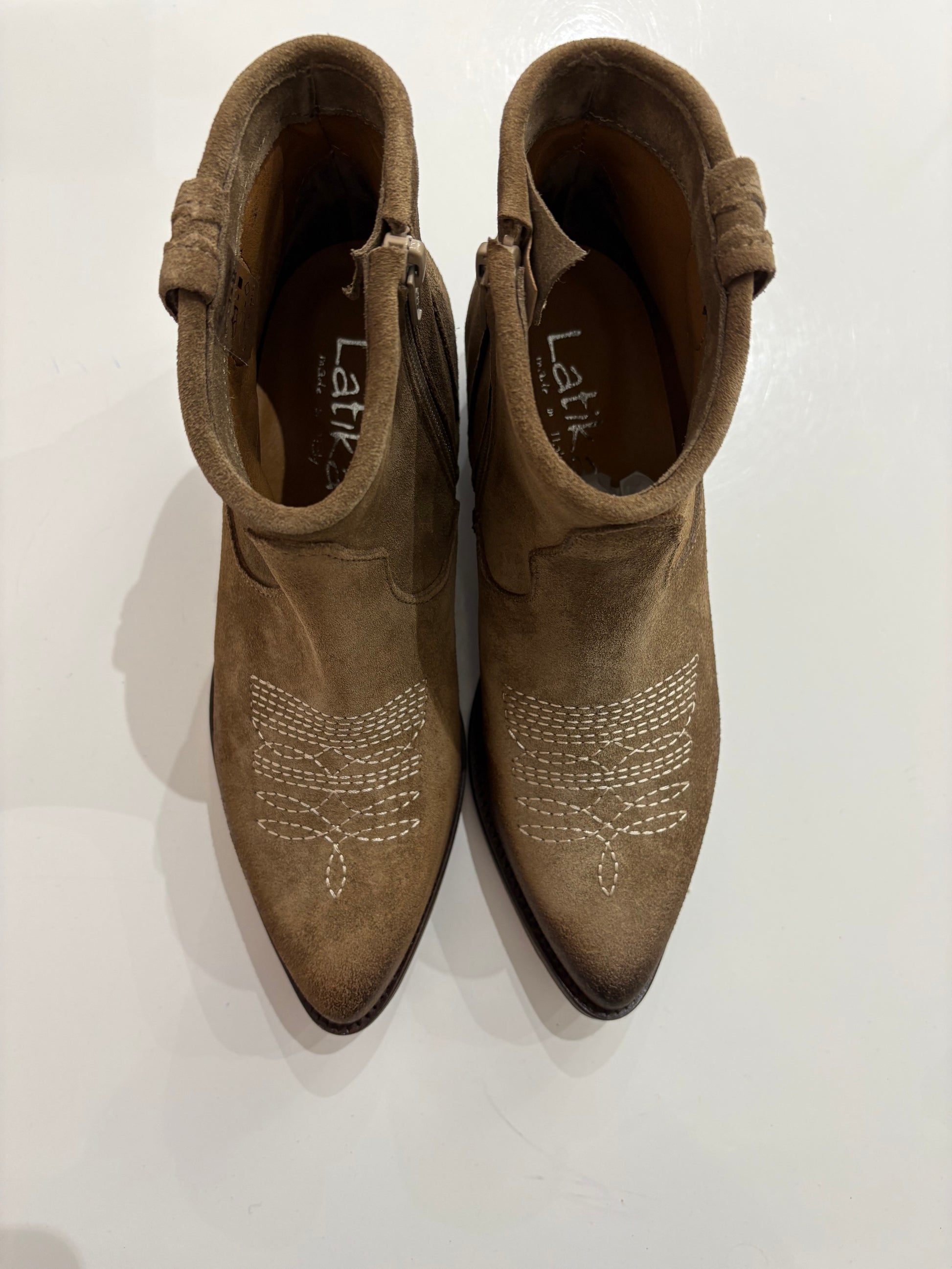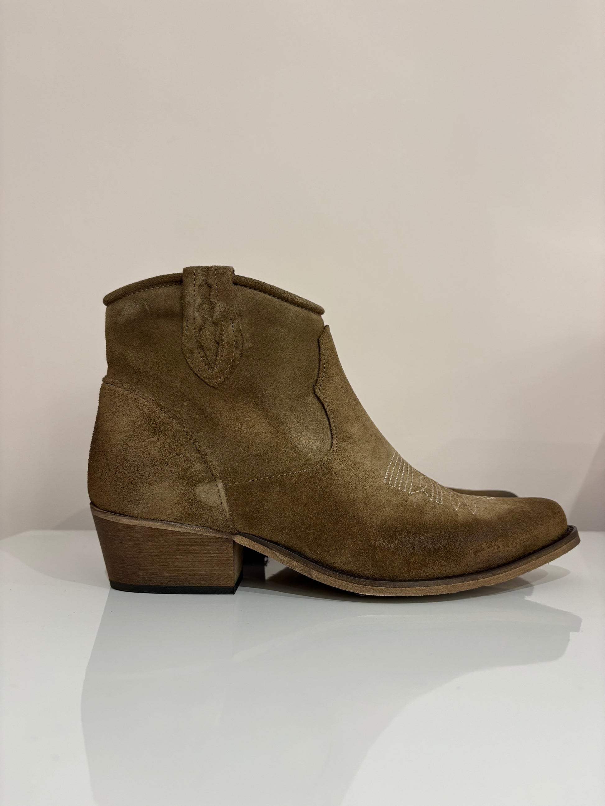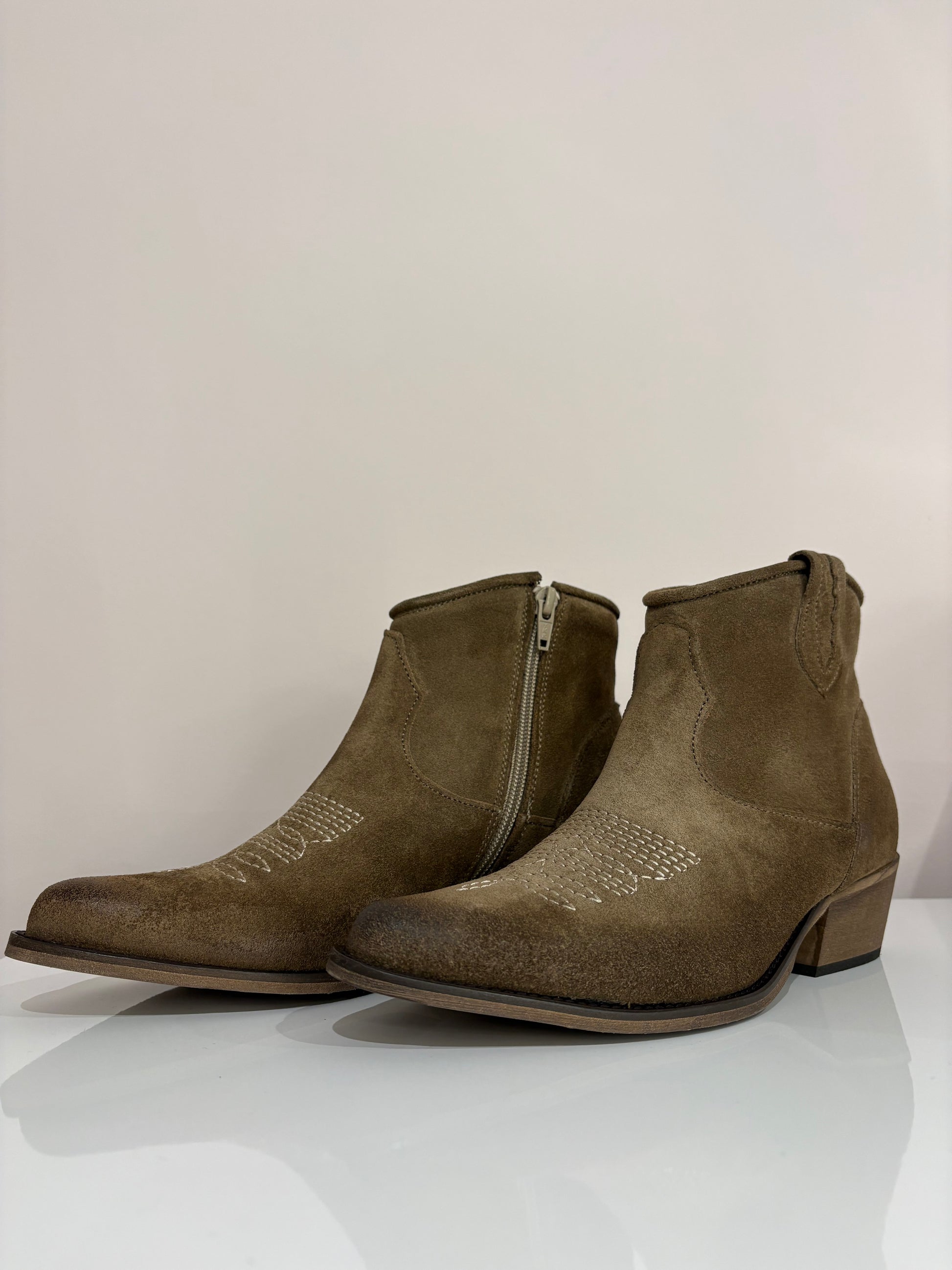 Texano basso scamosciato con ricami in contrasto sulla punta, chiusura con zip laterale