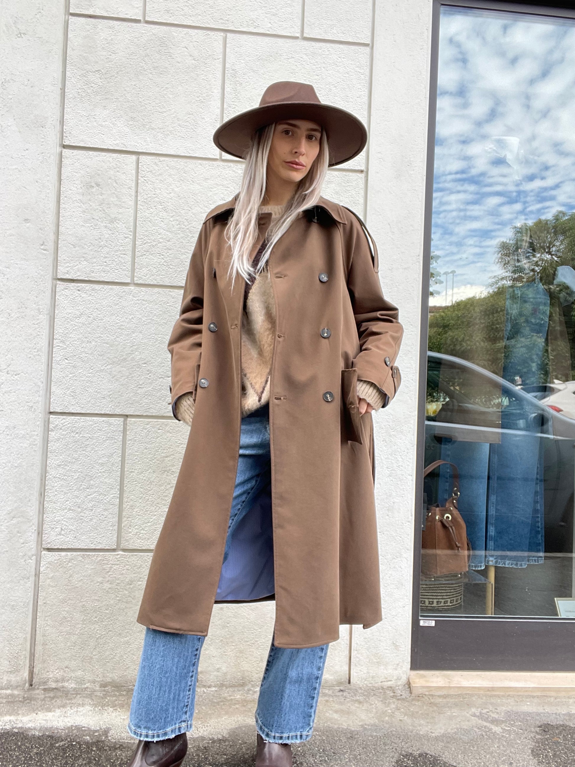 Trench lungo in tessuto mano pesca con fodera riga moro a doppiopetto con tasche laterali e passanti vita con cintura, asola con bottone sulle spalle e sul fondo manica