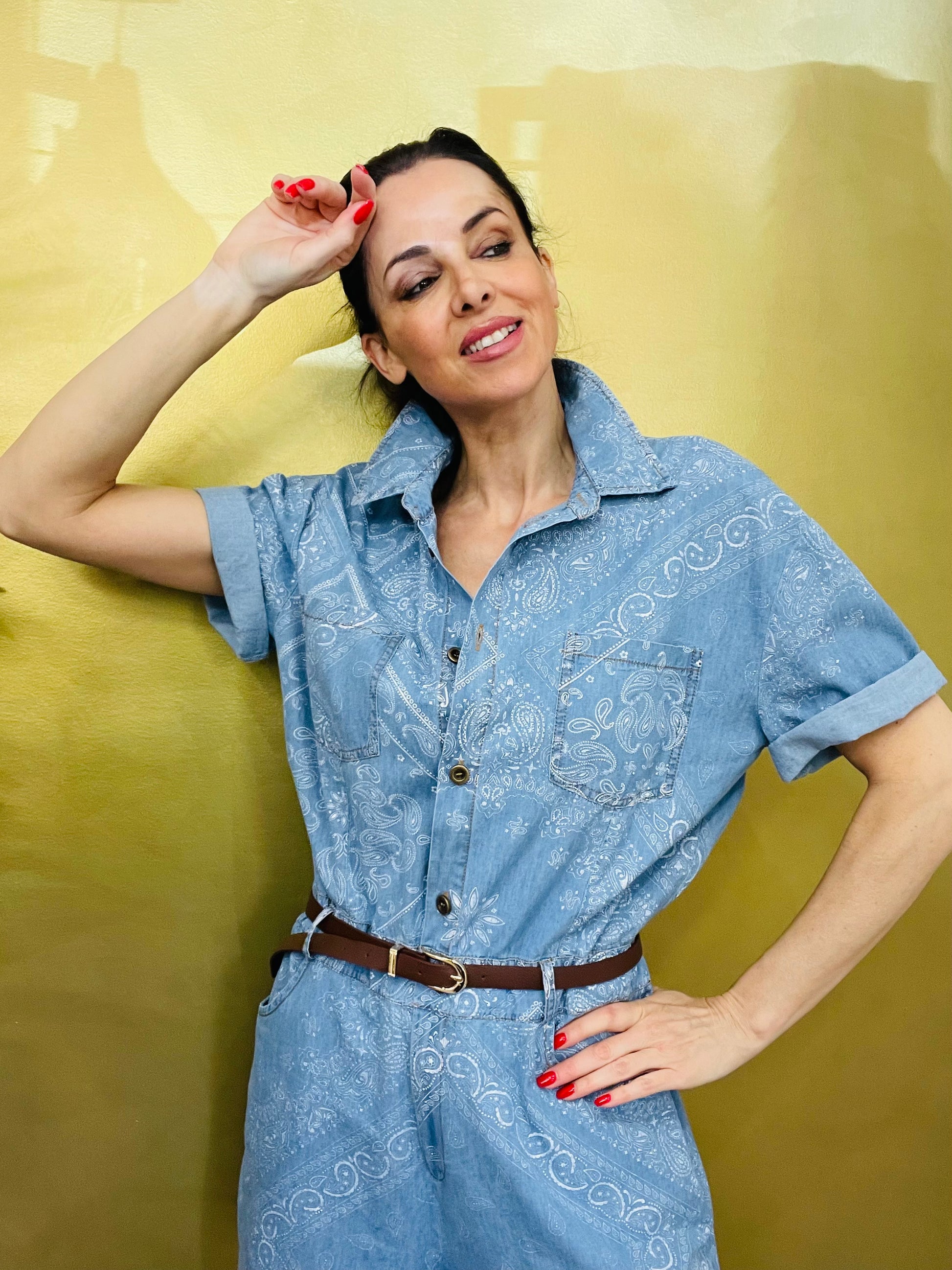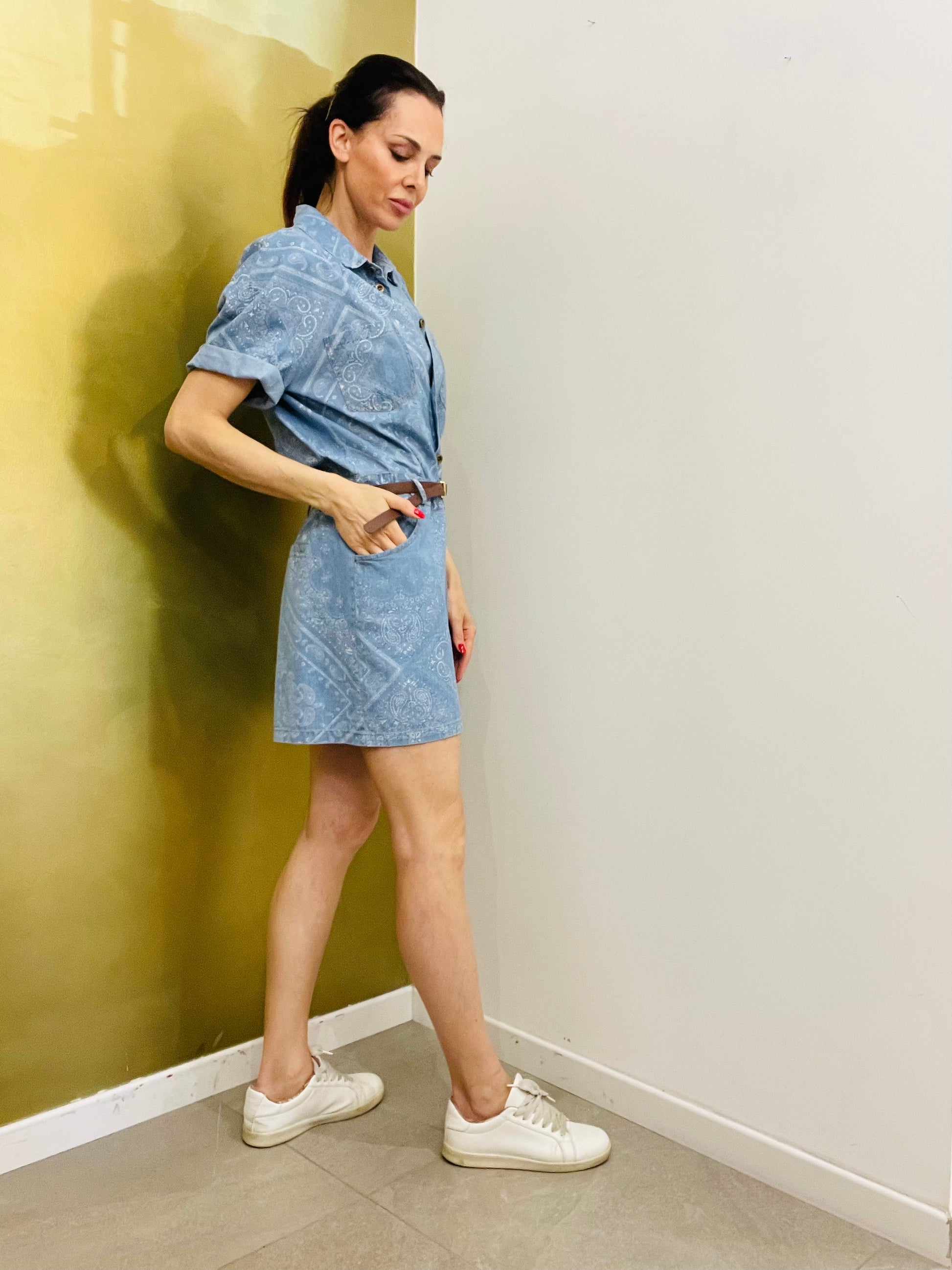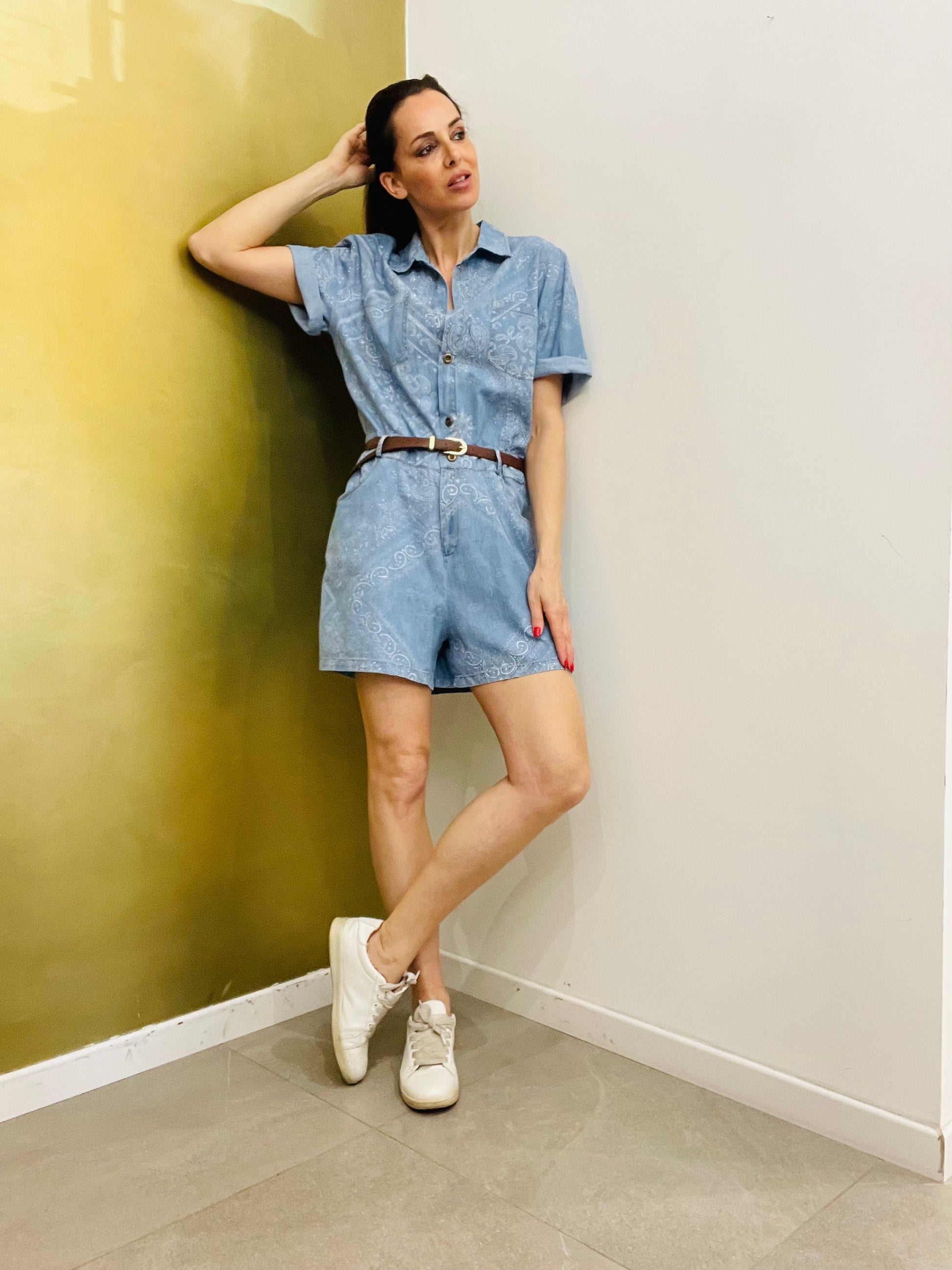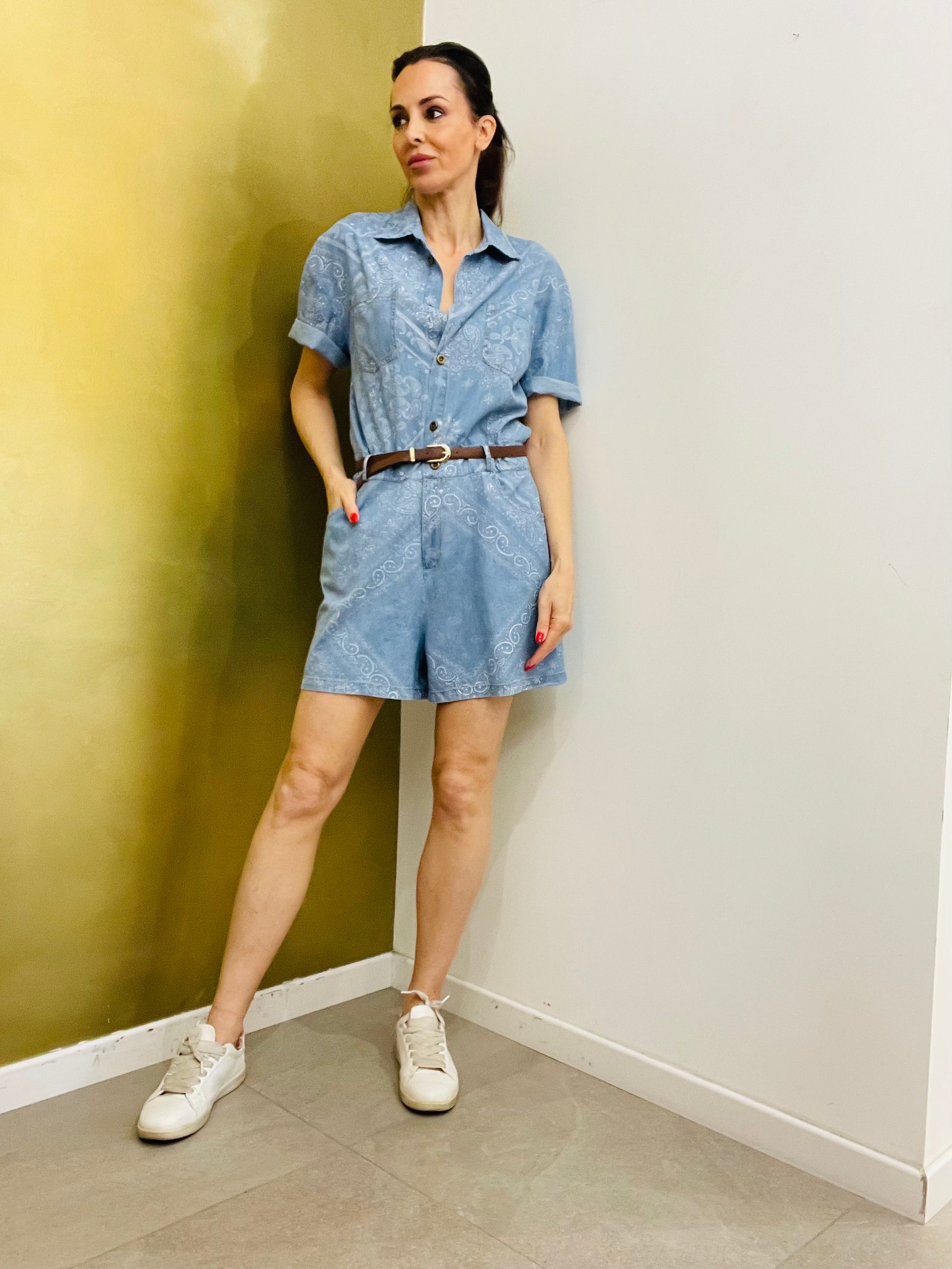 Tuta corta in cotone Chambrey stampato effetto Denim
